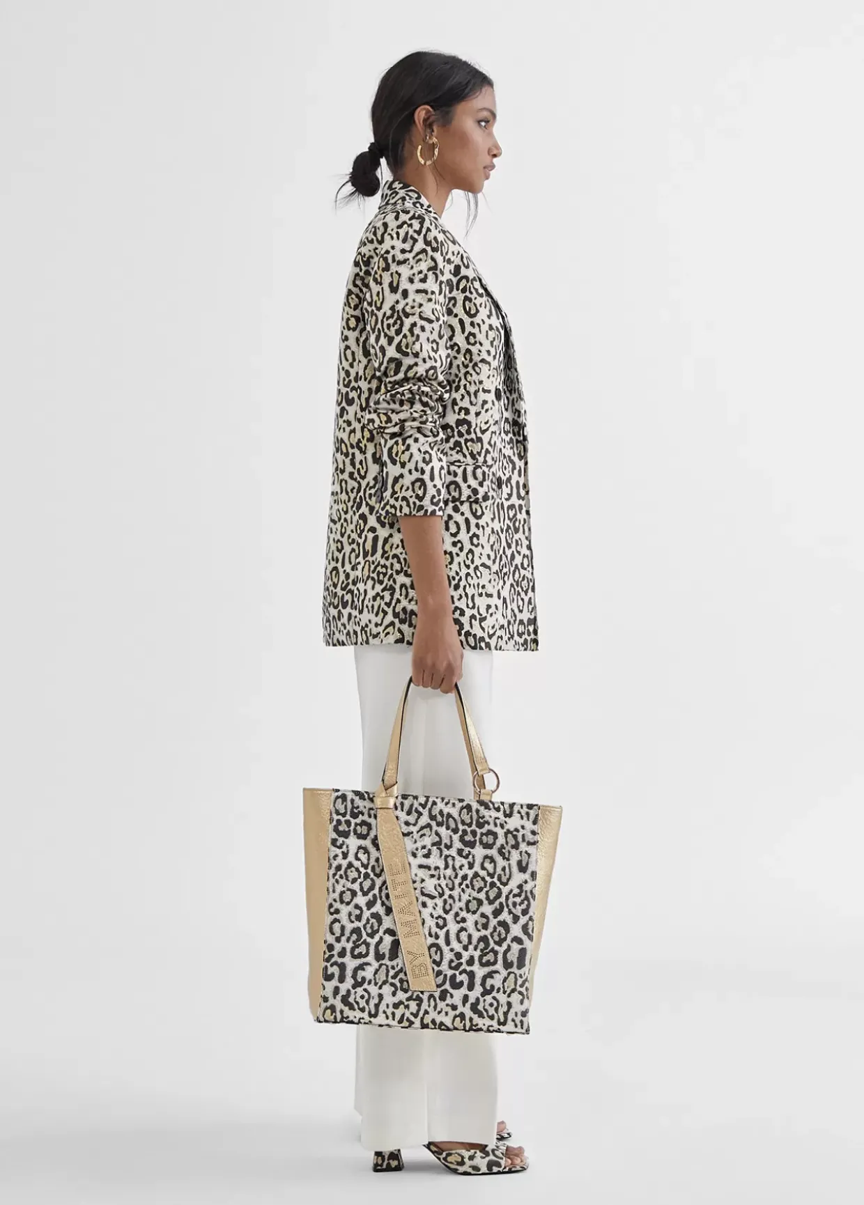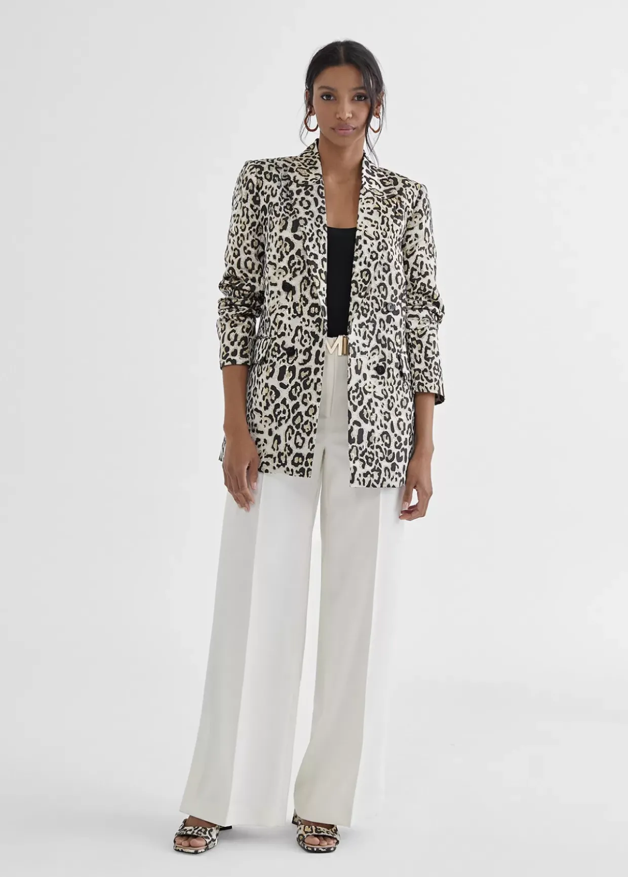 Blazer estampada animal print en tejido jacquard dorado. Cuello solapa y manga larga. Falso cruzado. Bolsillos con solapa en delantero.