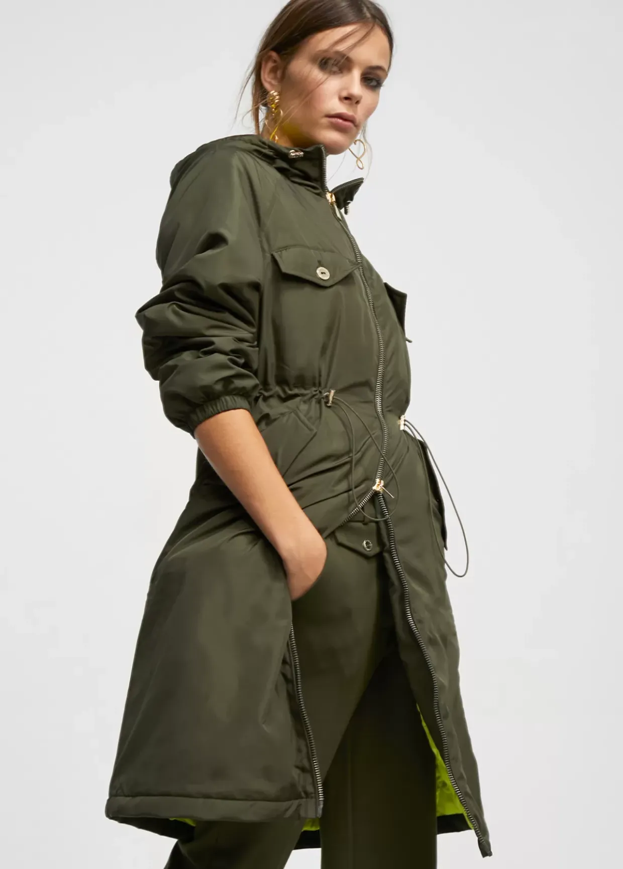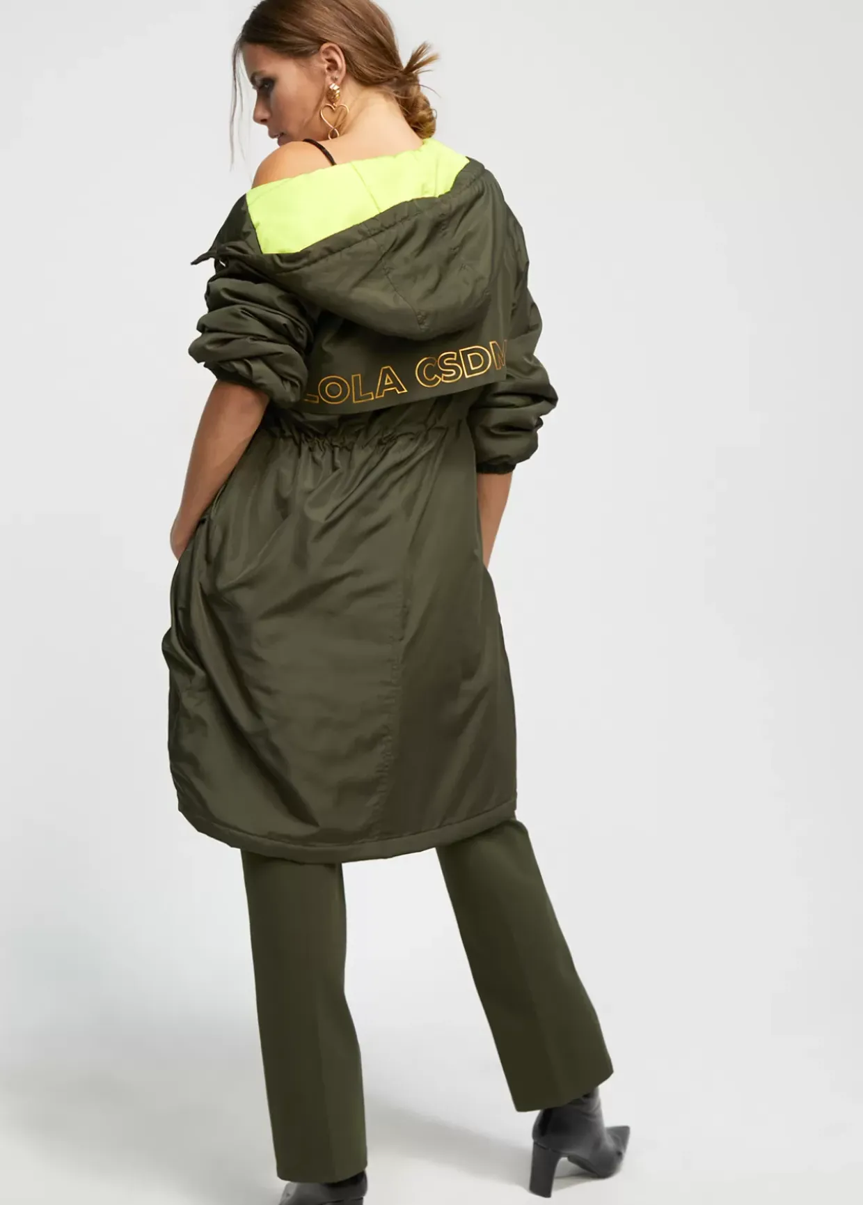 Anorak acolchado con capucha. Cierre con cremallera dorada de doble carro. Bolsillos frontales con tapete y botón. Cintura ajustable. Logo a contraste en espalda e interior acolchado en color lima.
