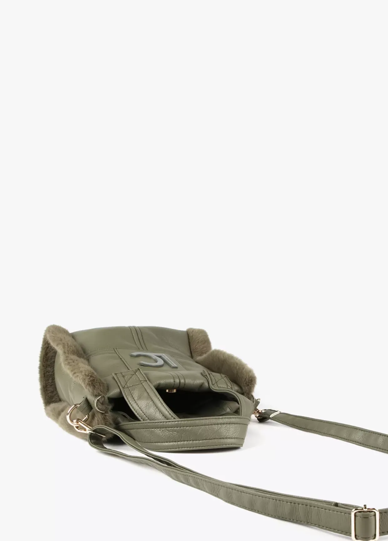 Bolso tipo bandolera en efecto piel y efecto pelo combinados. Asas de mano y asa bandolera ajustable y extraíble. Cierre con botón imantado y logo lacado en parte frontal.