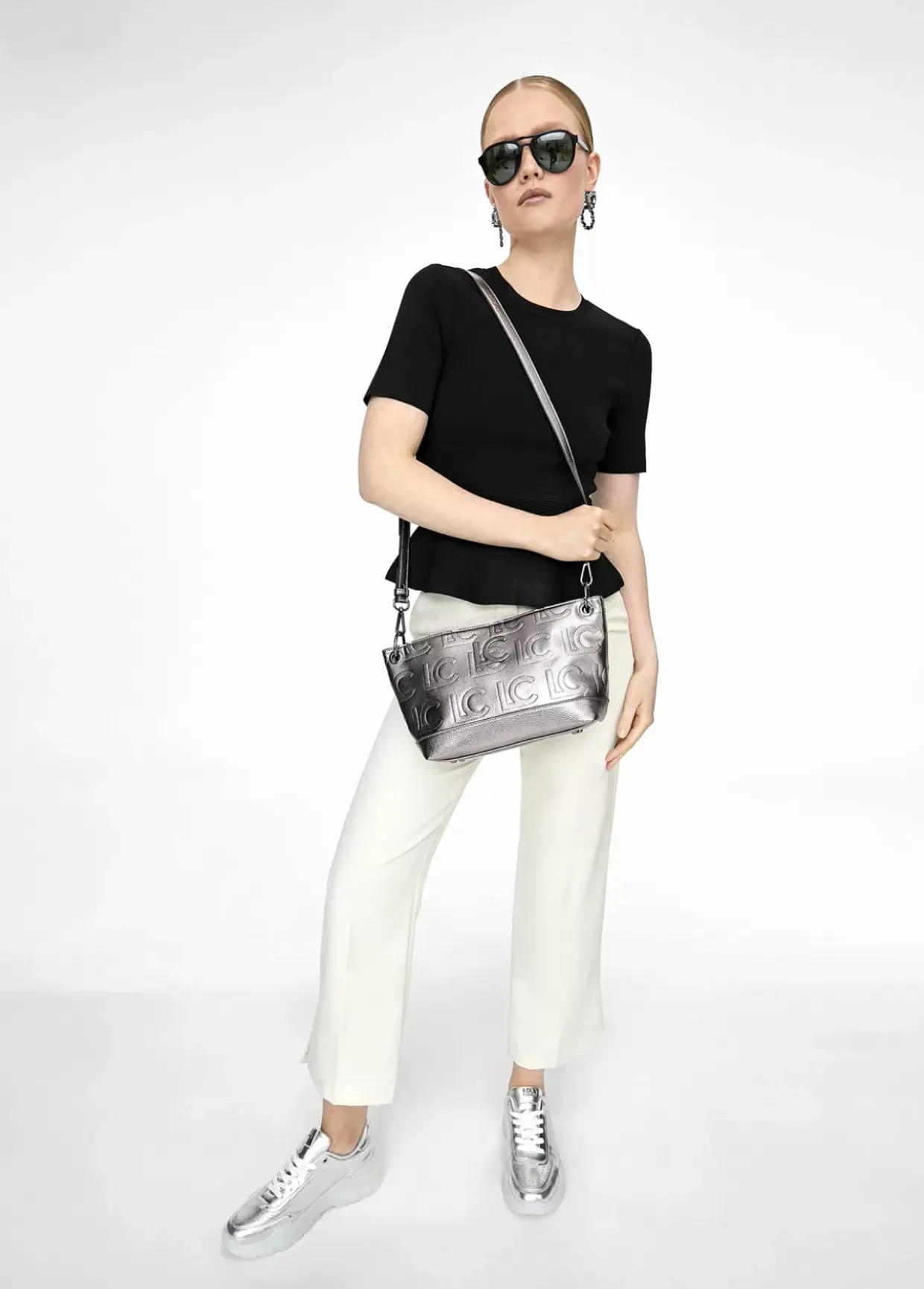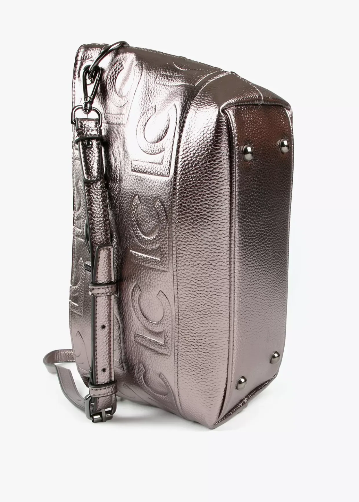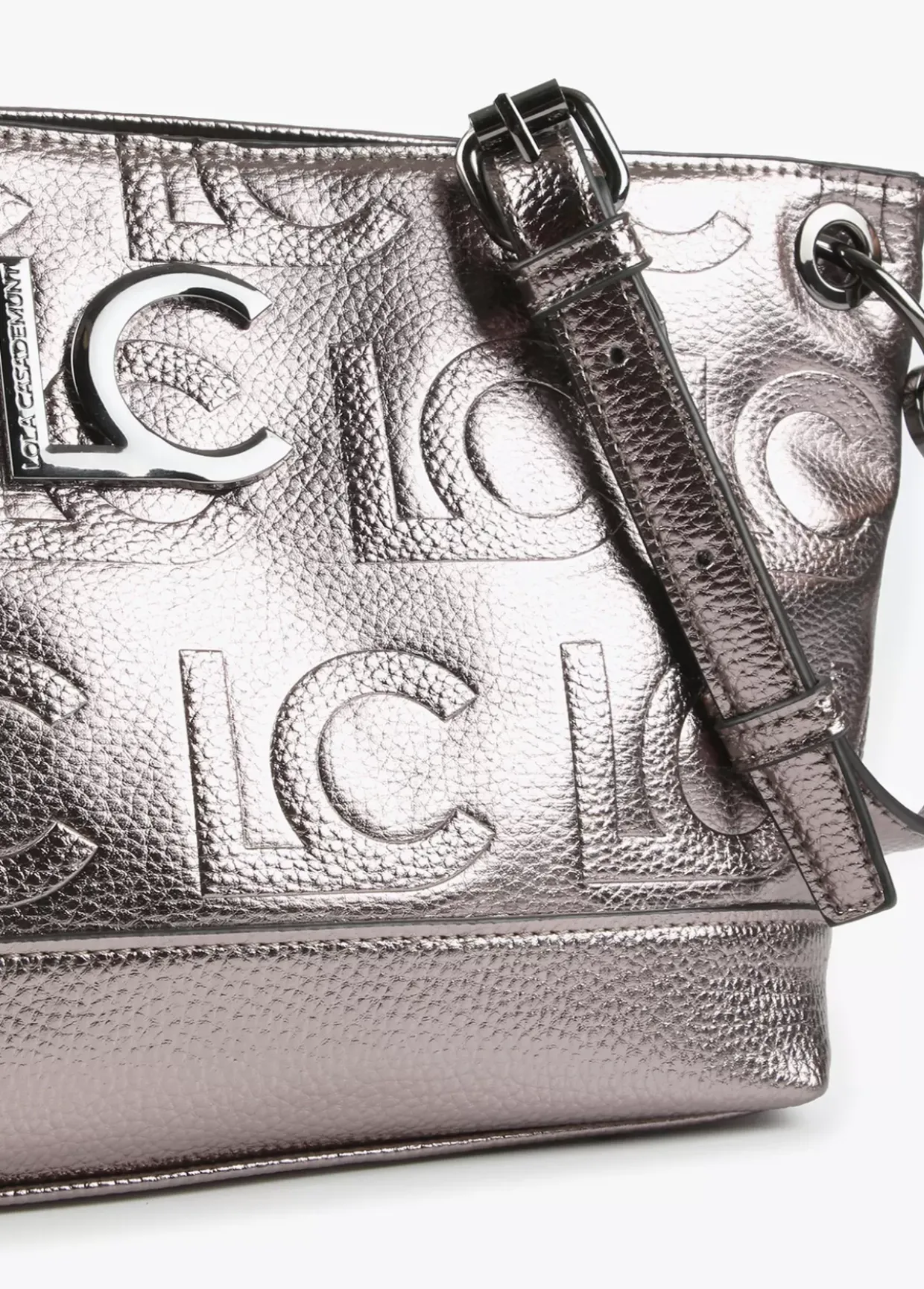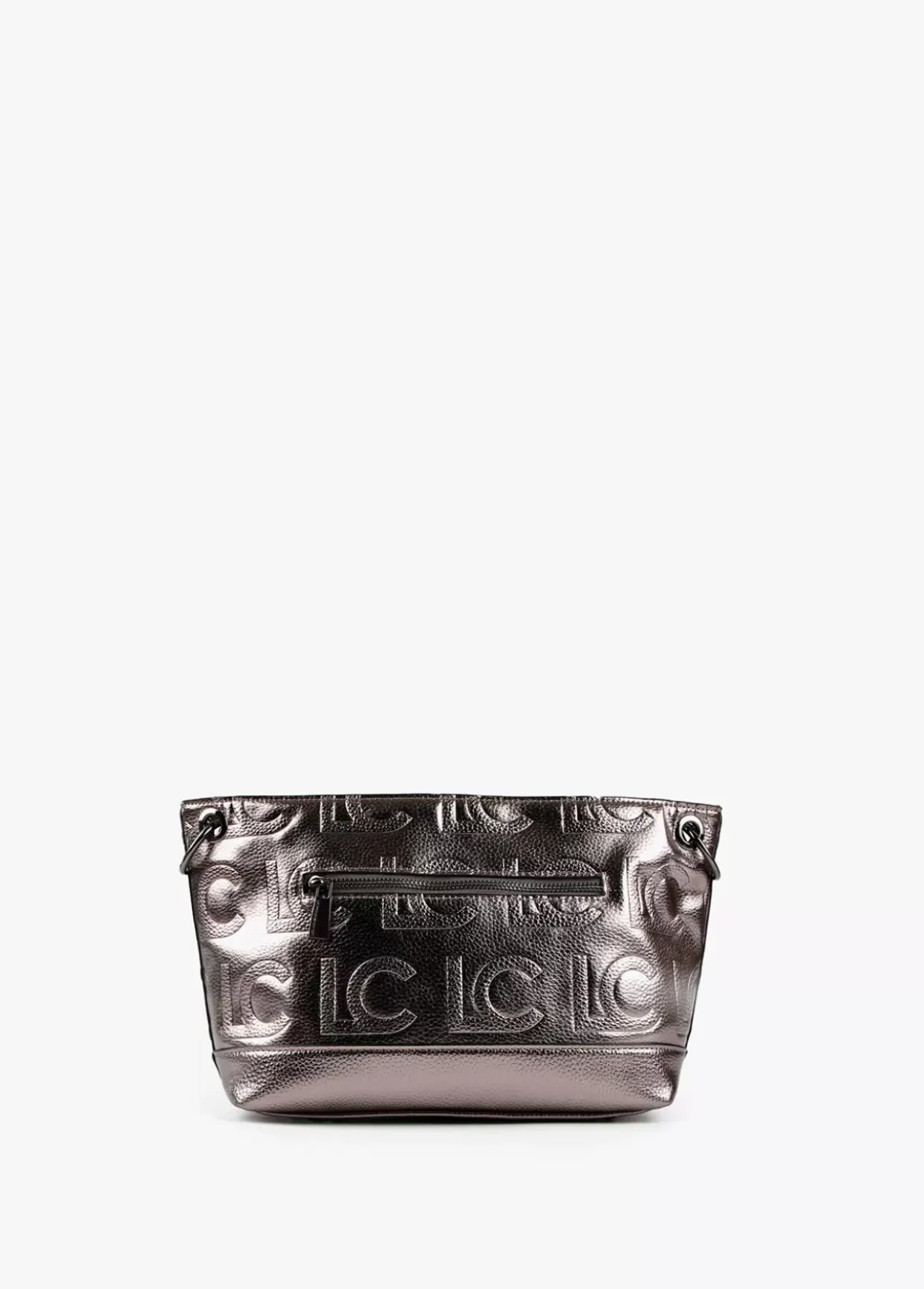 Bolso bandolera efecto piel metalizado y grabado. Letras logo frontales al tono. Bolsillo exterior y cierre central con cremallera.