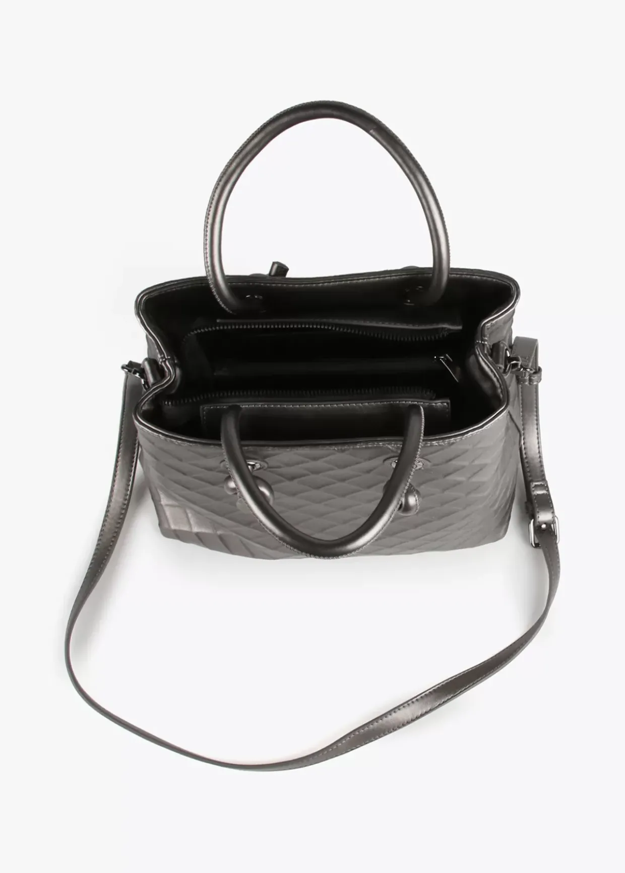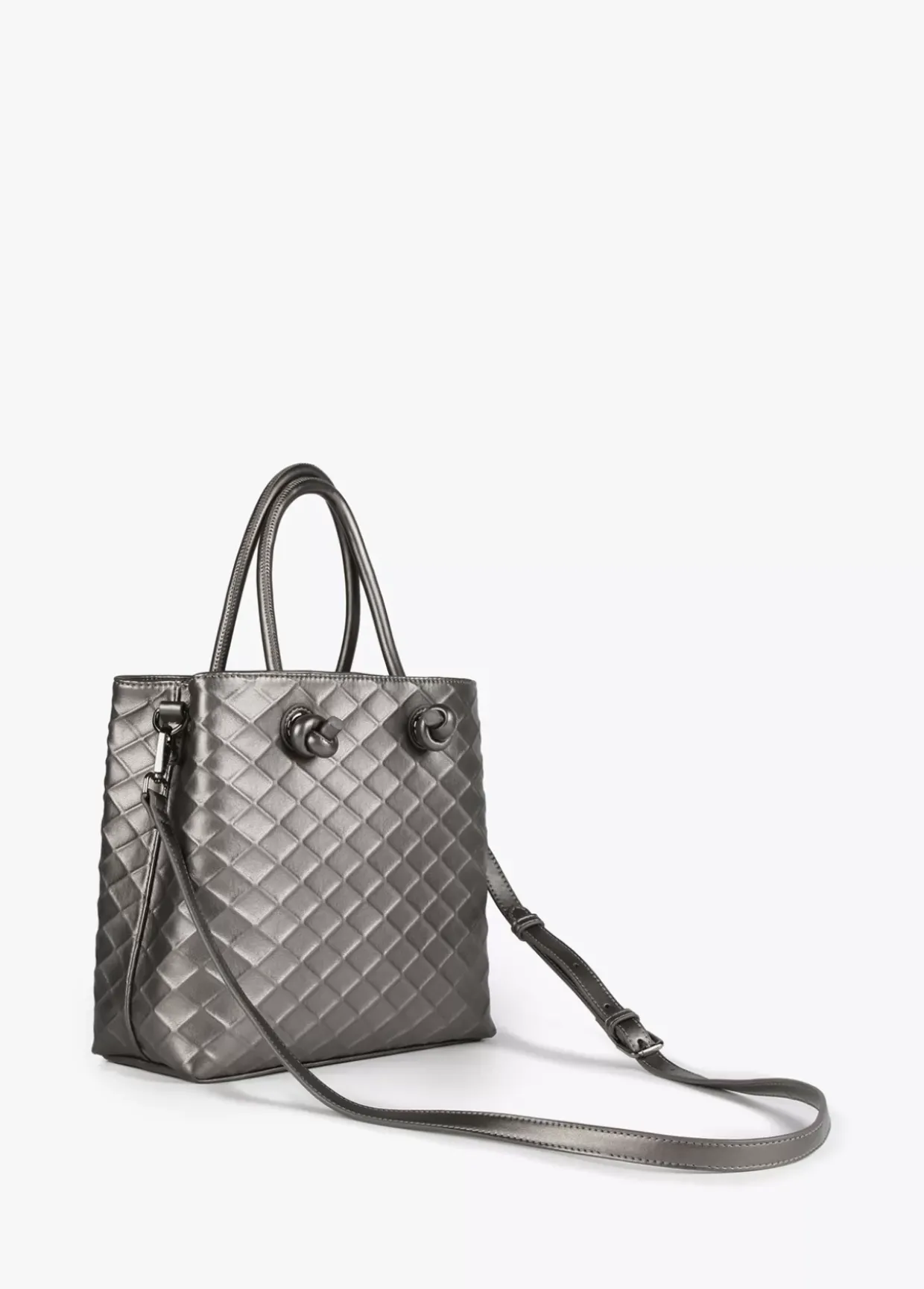 Bolso tipo bandolera en efecto piel con rombos en relieve. Asas de mano y asa bandolera extraíble. Logo en parte frontal al tono y cierre con cremallera.