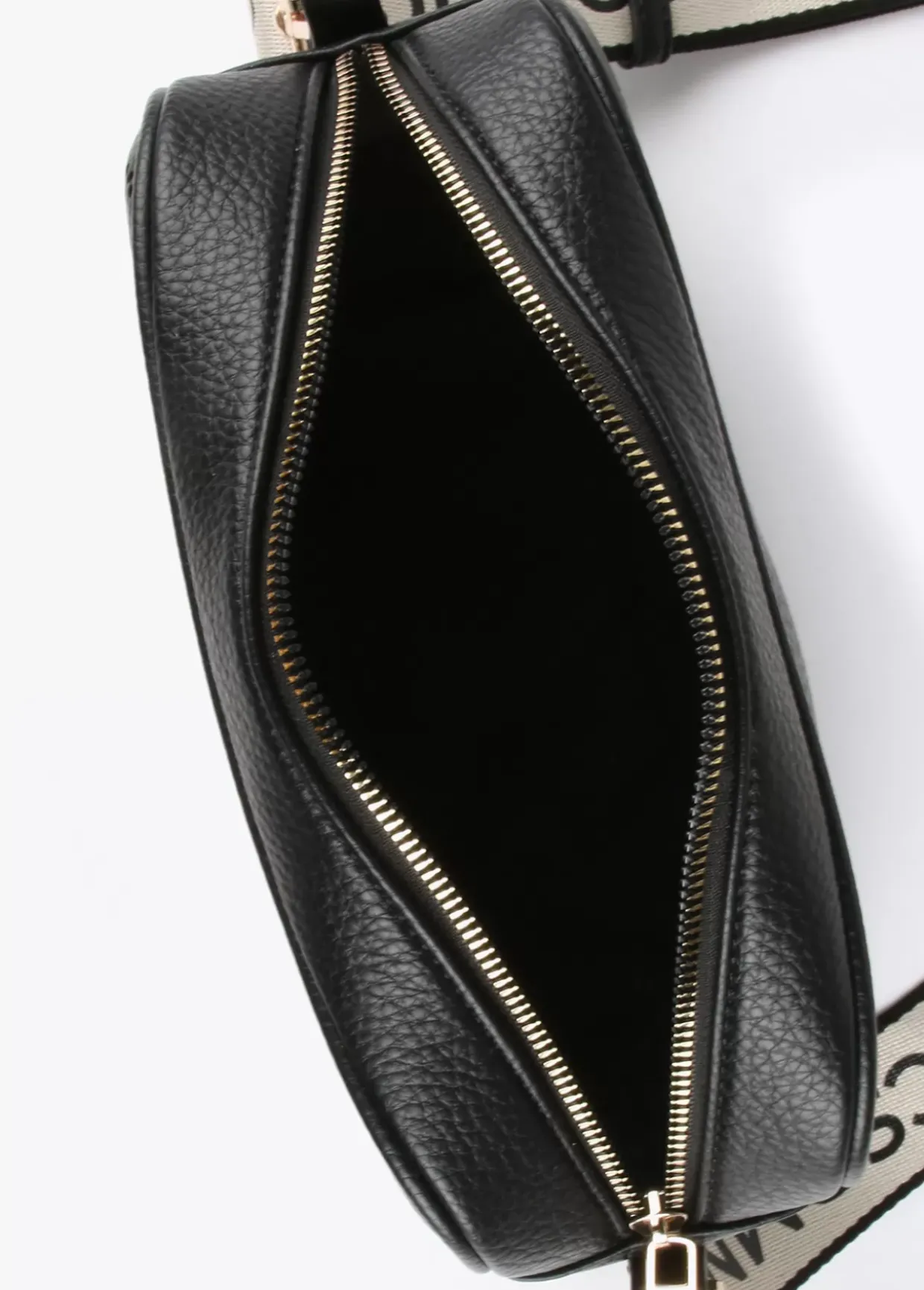 Bolso tipo bandolera con logotipo troquelado y logo lacado al tono en zona frontal. Cierre de cremallera y asa bandolera ajustable y extraíble.