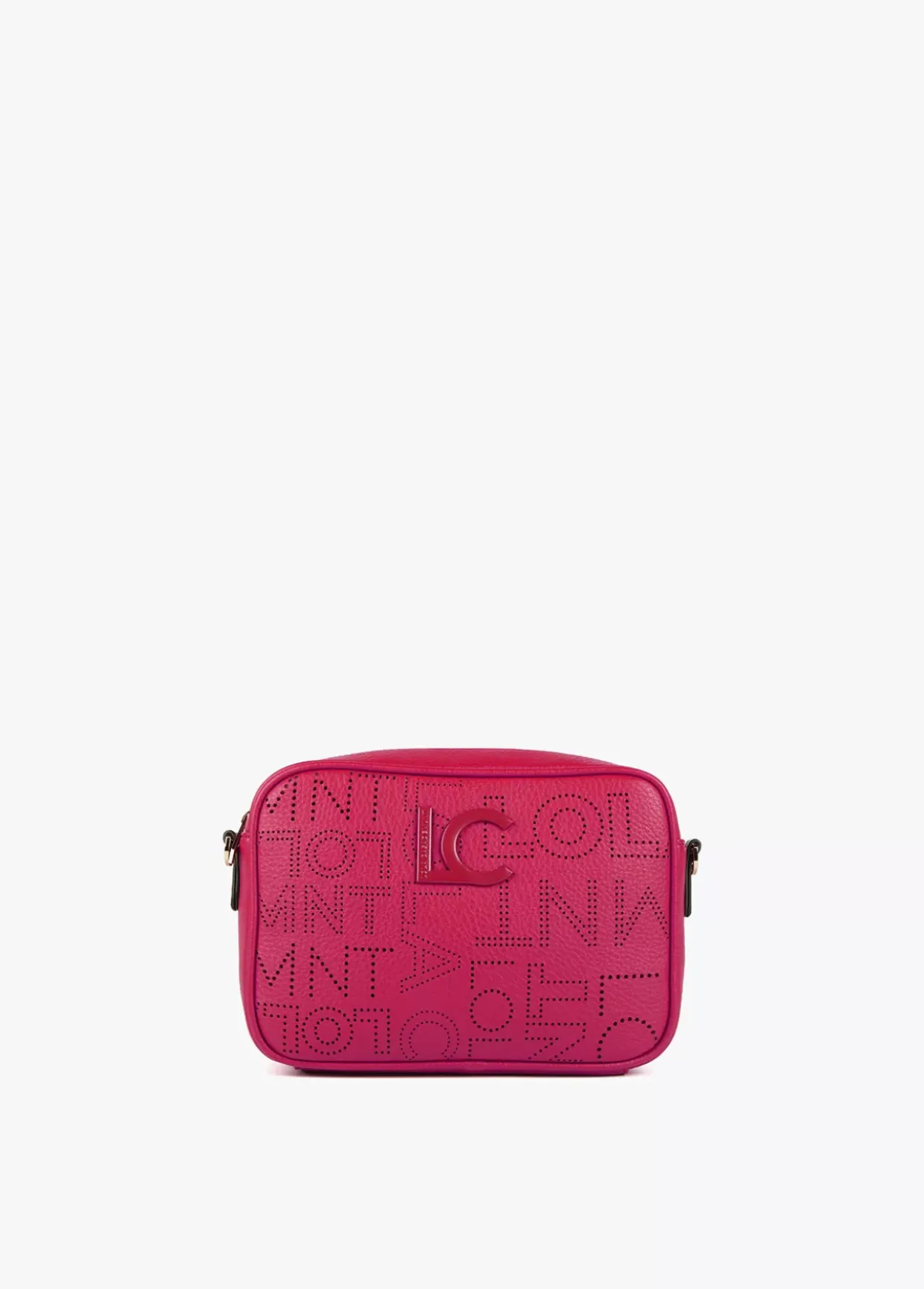 Bolso tipo bandolera con logotipo troquelado y logo lacado al tono en zona frontal. Cierre de cremallera y asa bandolera ajustable y extraíble.