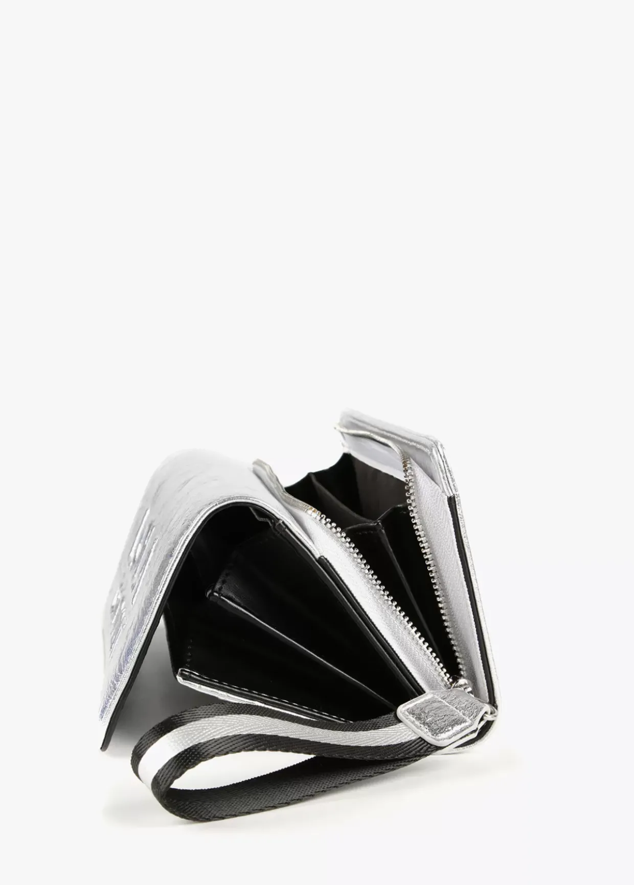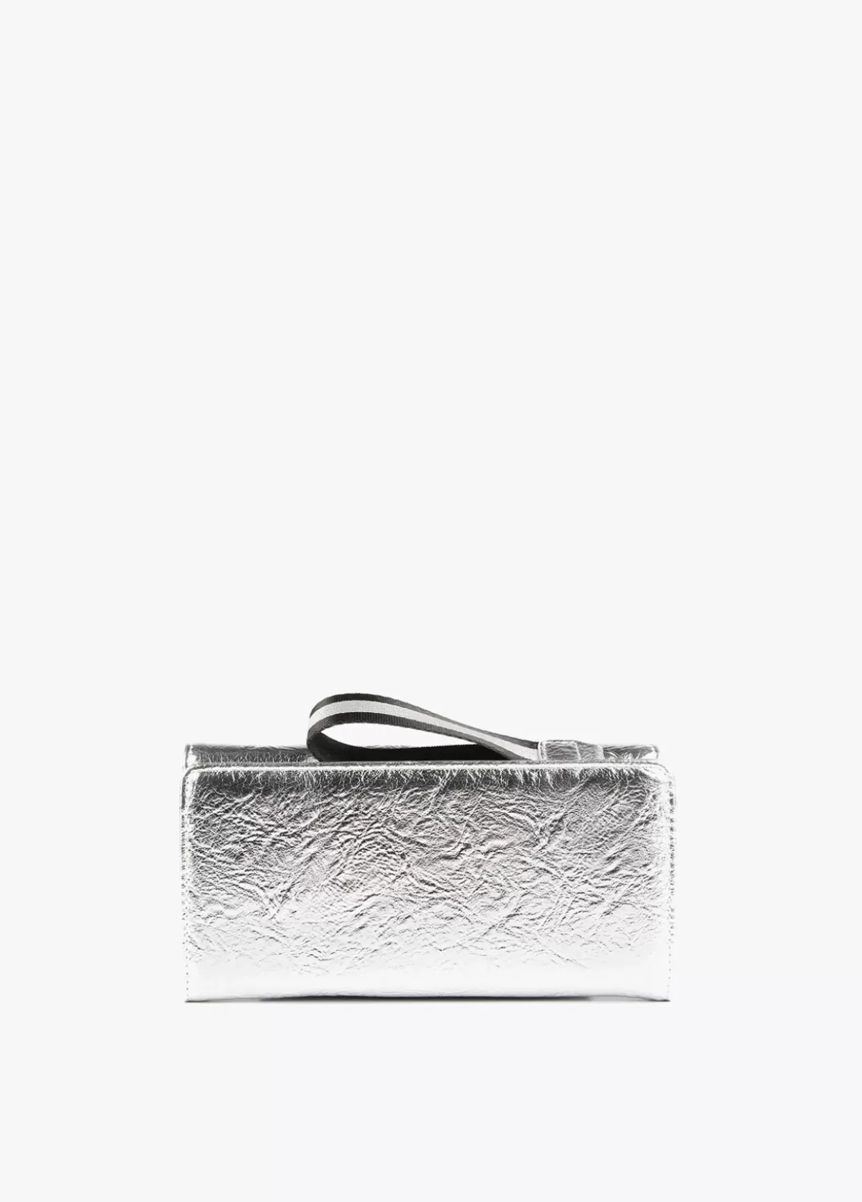 Billetero grande metalizado con logo grabado en parte frontal. Cierre con cremallera y botón clic. Detalle asa de mano.