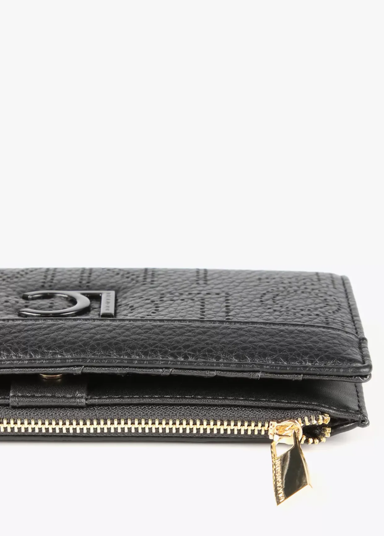 Billetero grande con logotipo troquelado. Cierre con cremallera en monedero y cierre con botón clic en zona tarjetero.