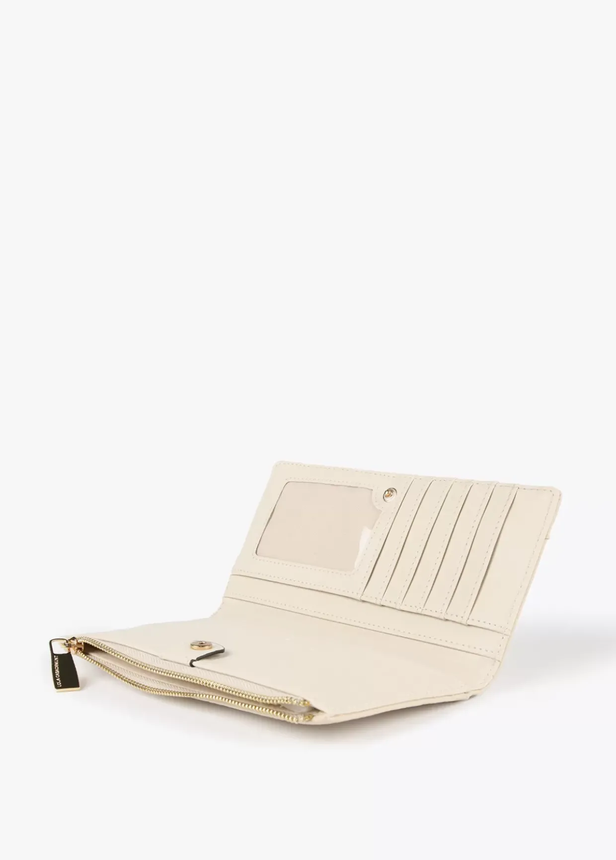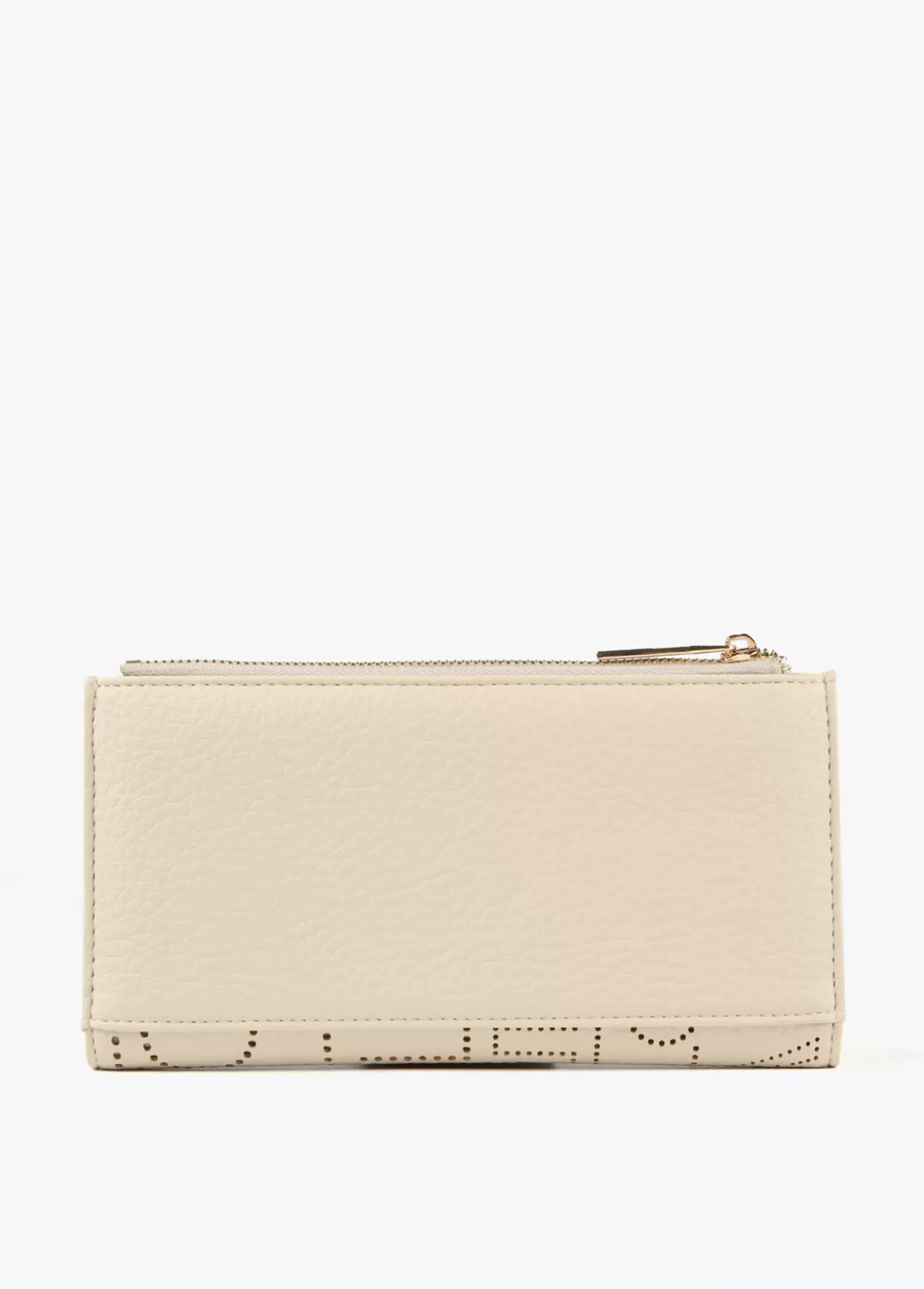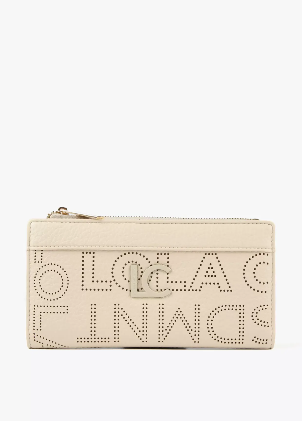 Billetero grande con logotipo troquelado. Cierre con cremallera en monedero y cierre con botón clic en zona tarjetero.