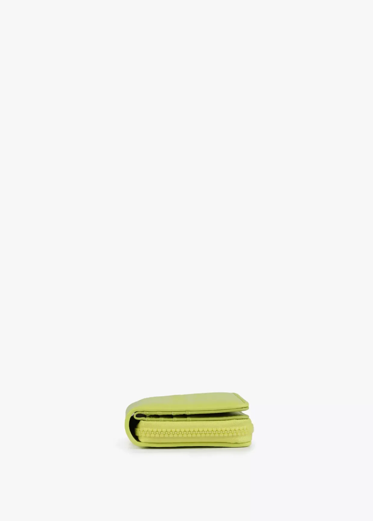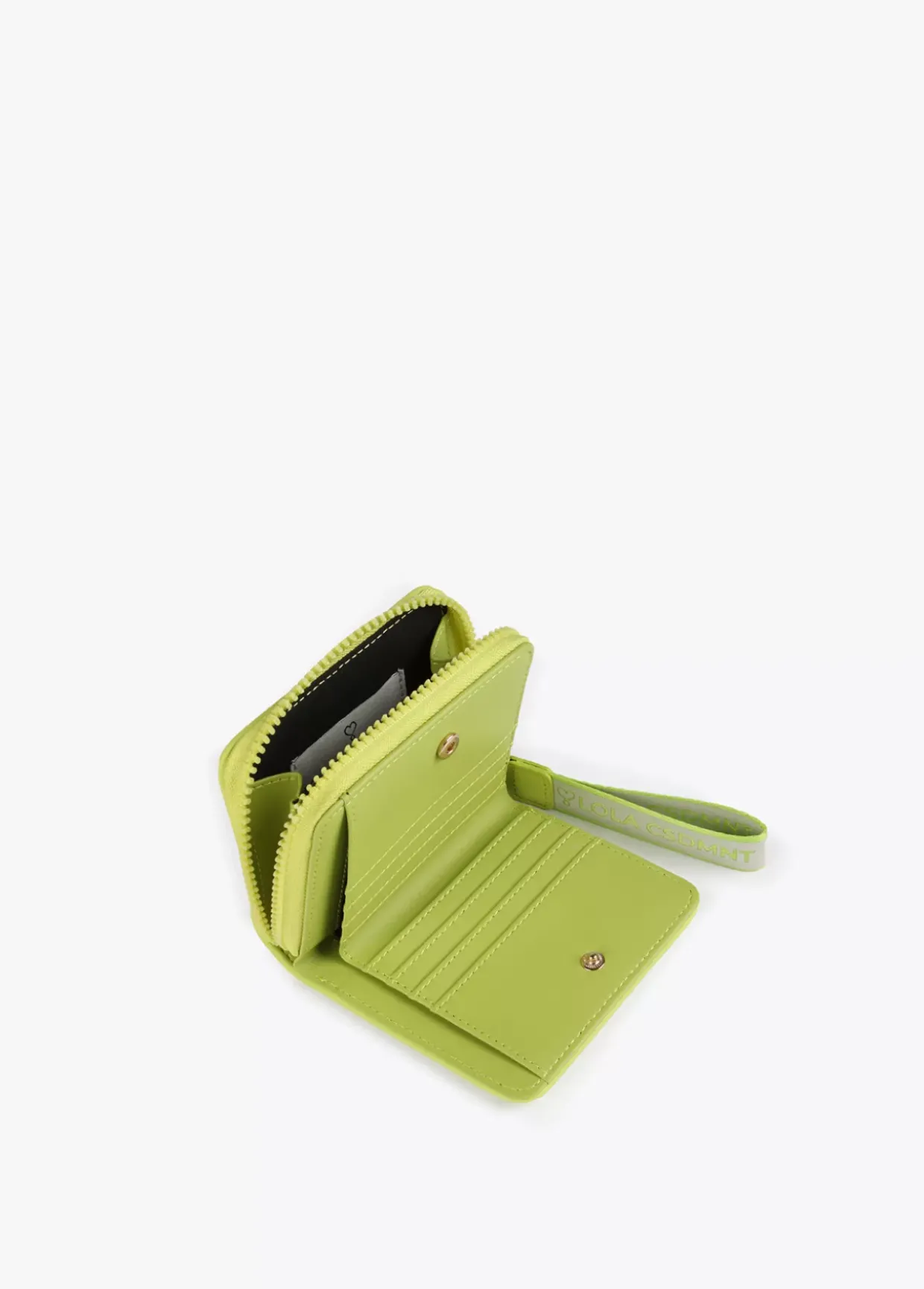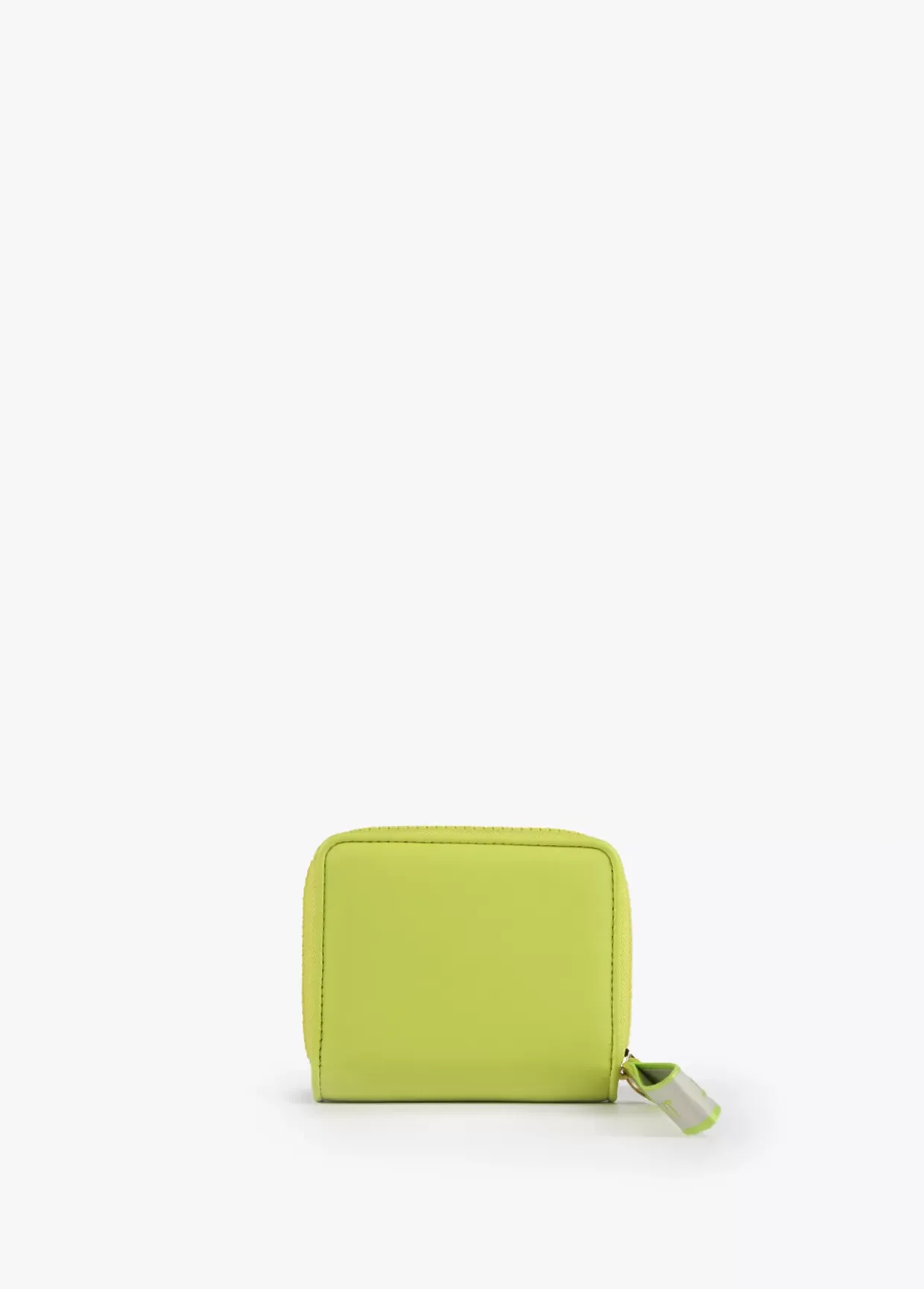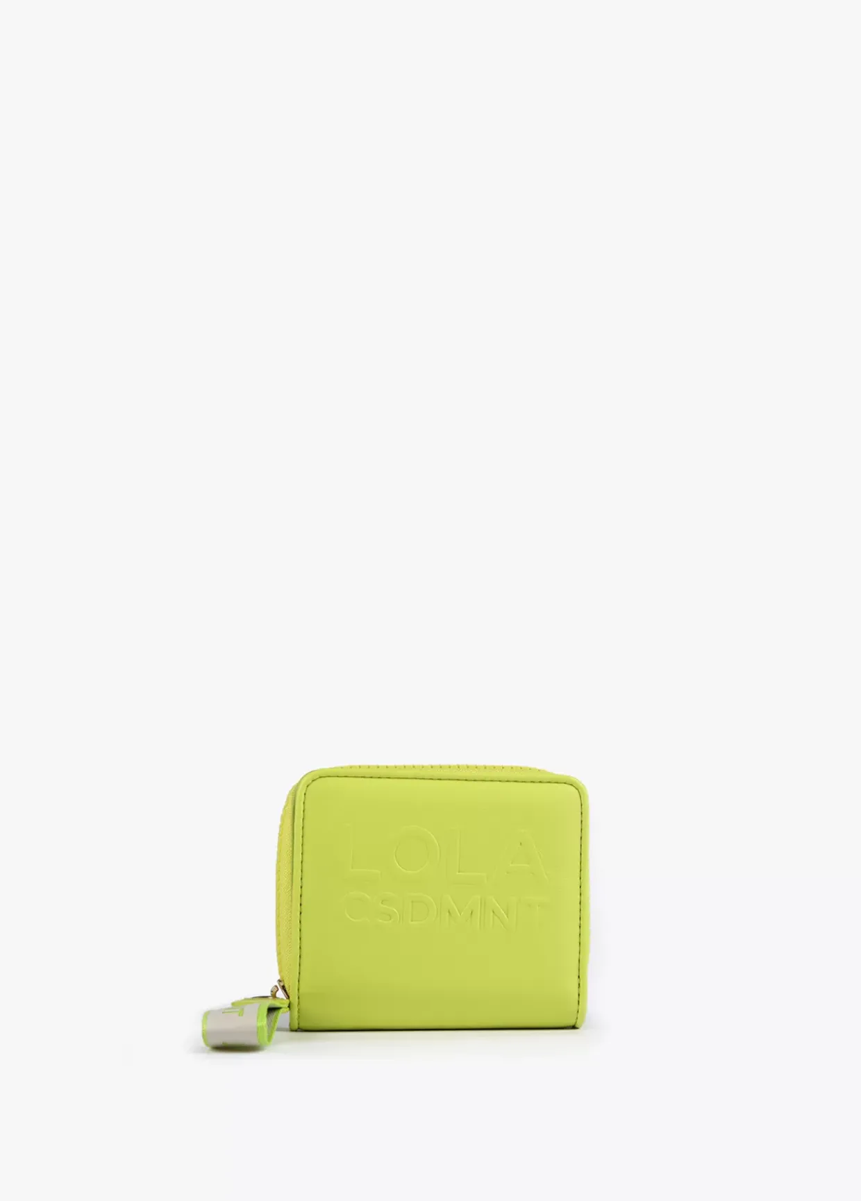 Billetero pequeño en efecto piel y logo en relieve. Asa de mano logotipada, cierre de cremallera y logo lacado en parte frontal.