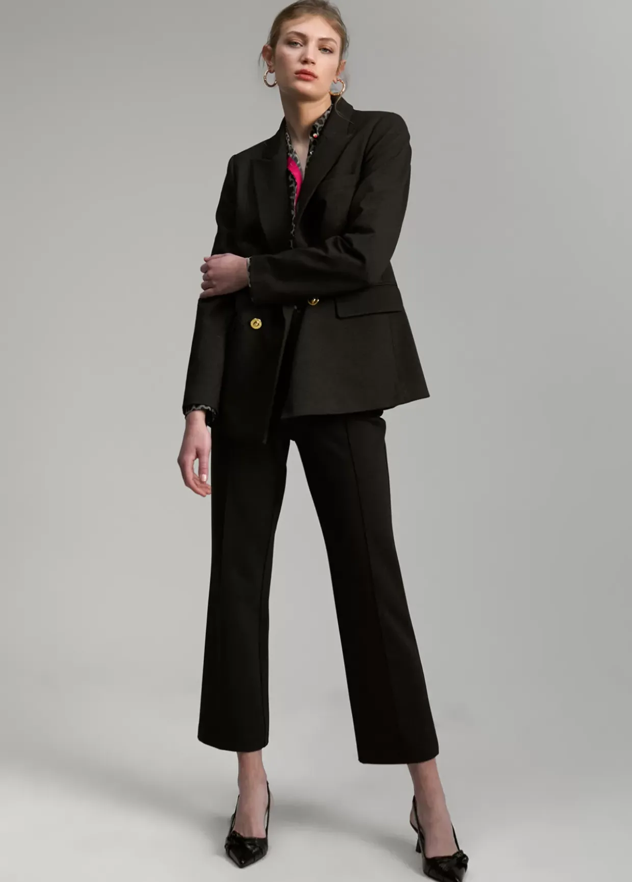 Blazer cruzada con detalle botón metálico animal. Cuello solapa. Tapetes con vivo de falso bolsillo lateral.