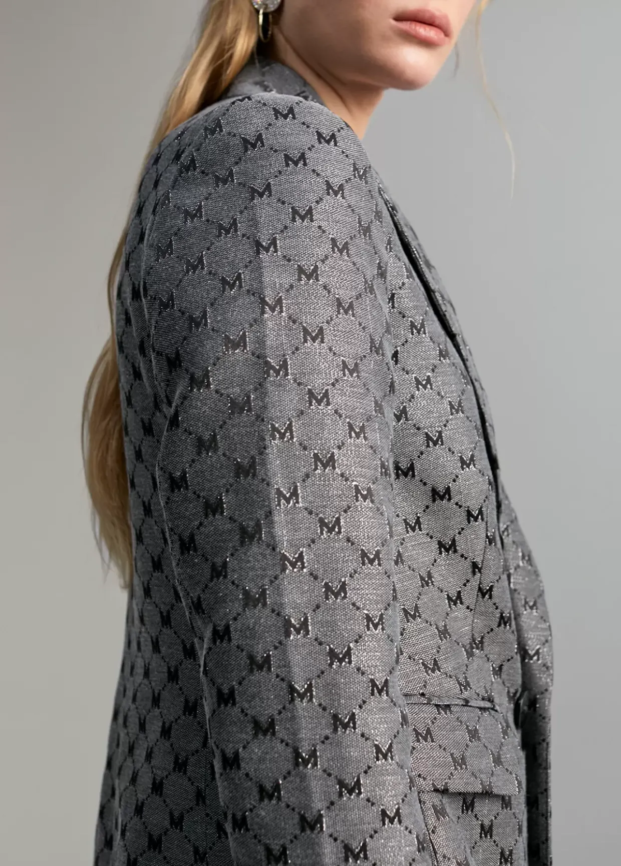 Blazer jacquard en monograma M bicolor en lúrex. Cuello solapa y cruzada con botones. Tapete de bolsillos en laterales.