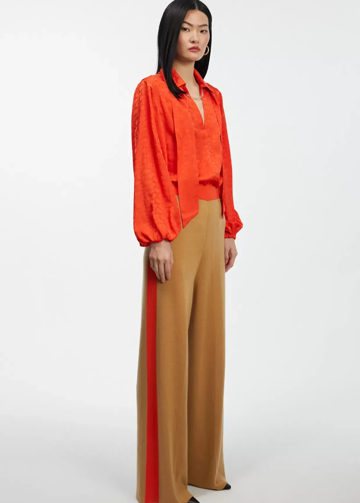 Blusa de tejido logotipado a tono. Con escote pico y lazo del mismo tejido, estampado y color. Mangas ligeramente abollonadas con puños elásticos.