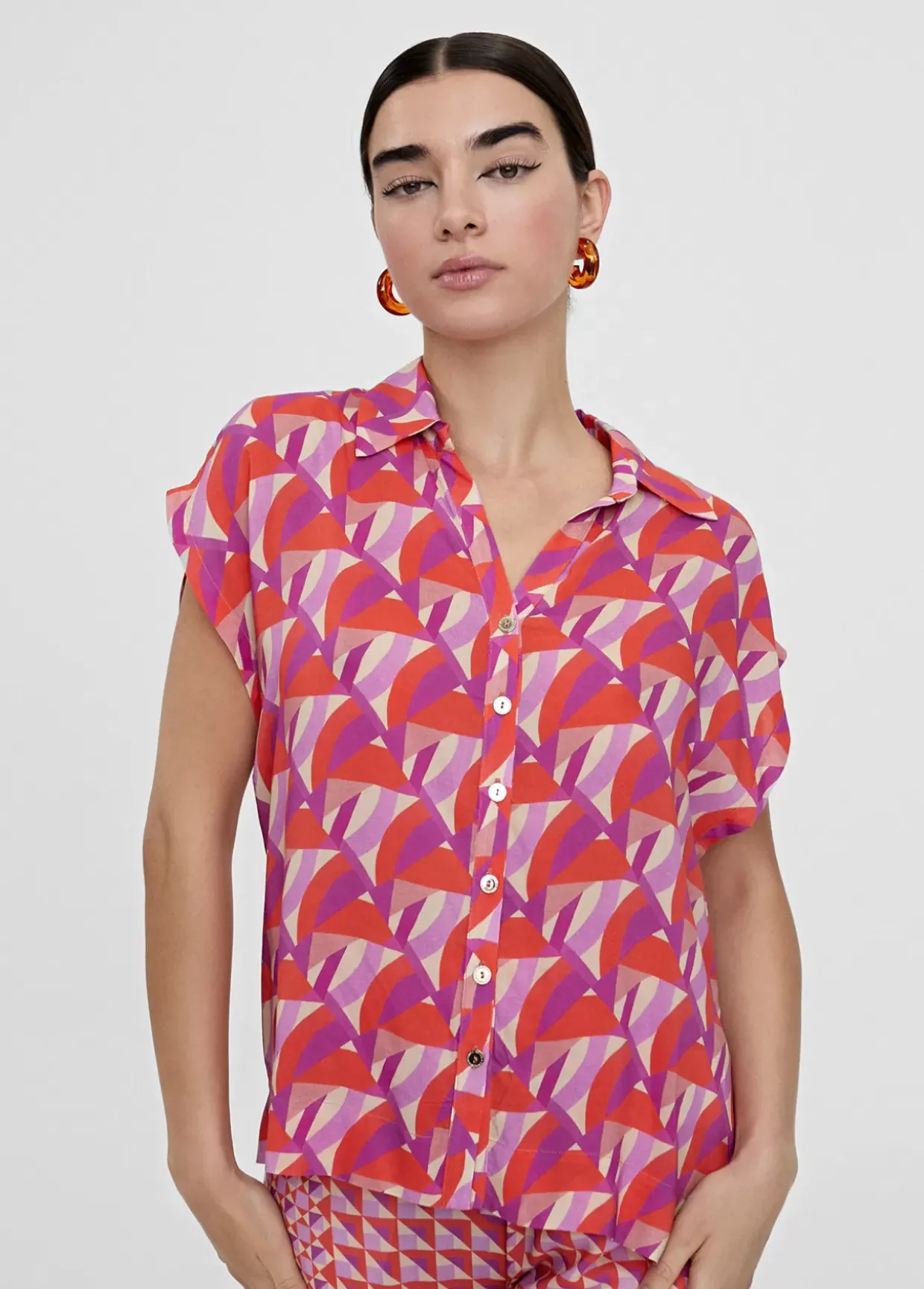 Blusa fluida. Estampado maxi geométrico en frontal y tipo corbatero en espalda. Cuello camisero y manga caída. Cerrada con botones dorados.