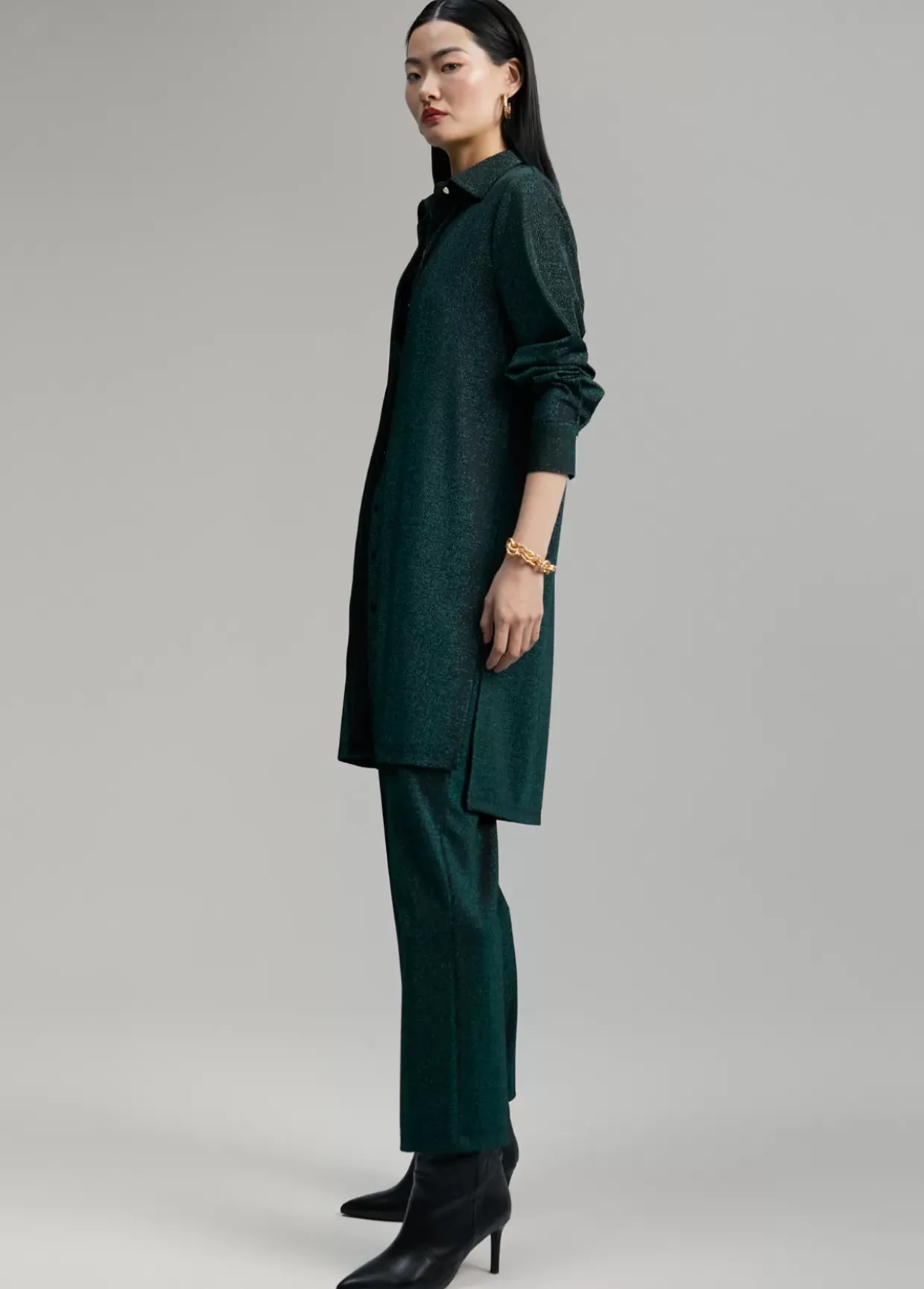 Blusón largo de punto con lúrex. Cuello camisero y cerrado con botones frontales y en puños. Aberturas laterales en bajo.