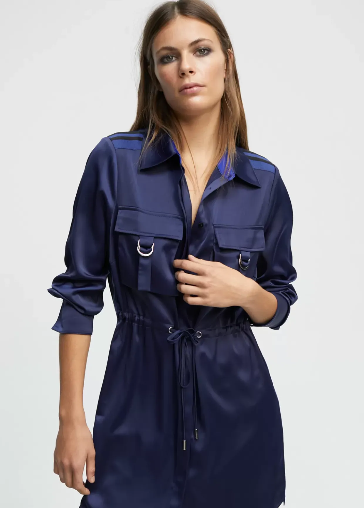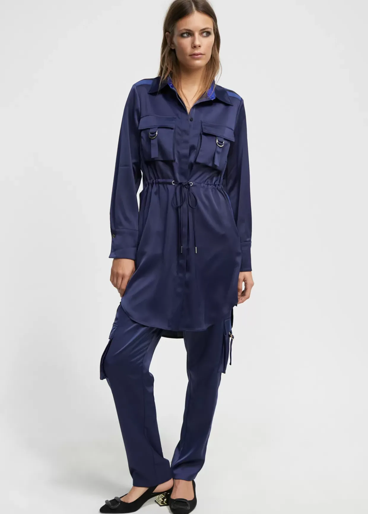 Blusón satinado con cuello y puños camiseros. Abierto con botones bajo tapete hasta cintura. Bolsillos plastrón con tapete y hebilla metálica. Cintura ajustable.