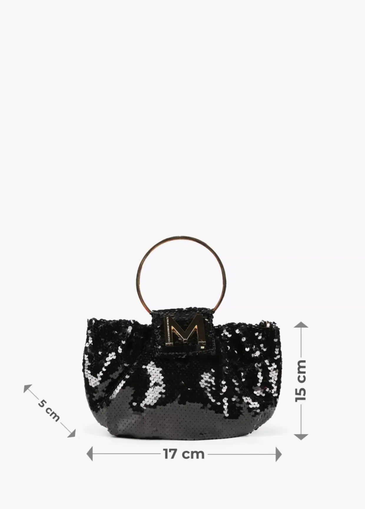 Bolsito bandolera de lentejuelas con asa de mano rígida y asa bandolera de cadena dorada extraíble. Maxi letra M dorada en solapa cierre y cierre de cremallera.