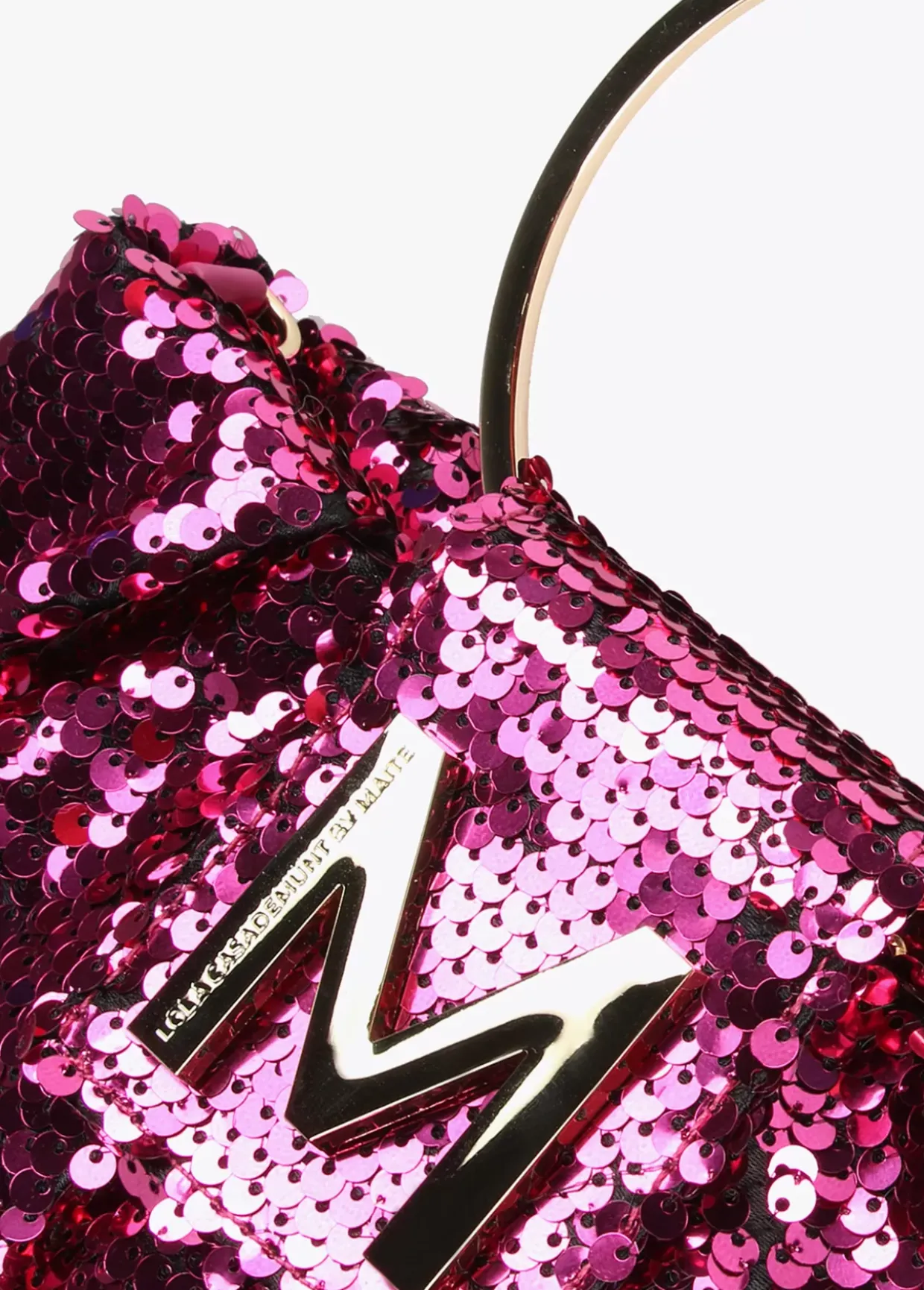 Bolsito bandolera de lentejuelas con asa de mano rígida y asa bandolera de cadena dorada extraíble. Maxi letra M dorada en solapa cierre y cierre de cremallera.