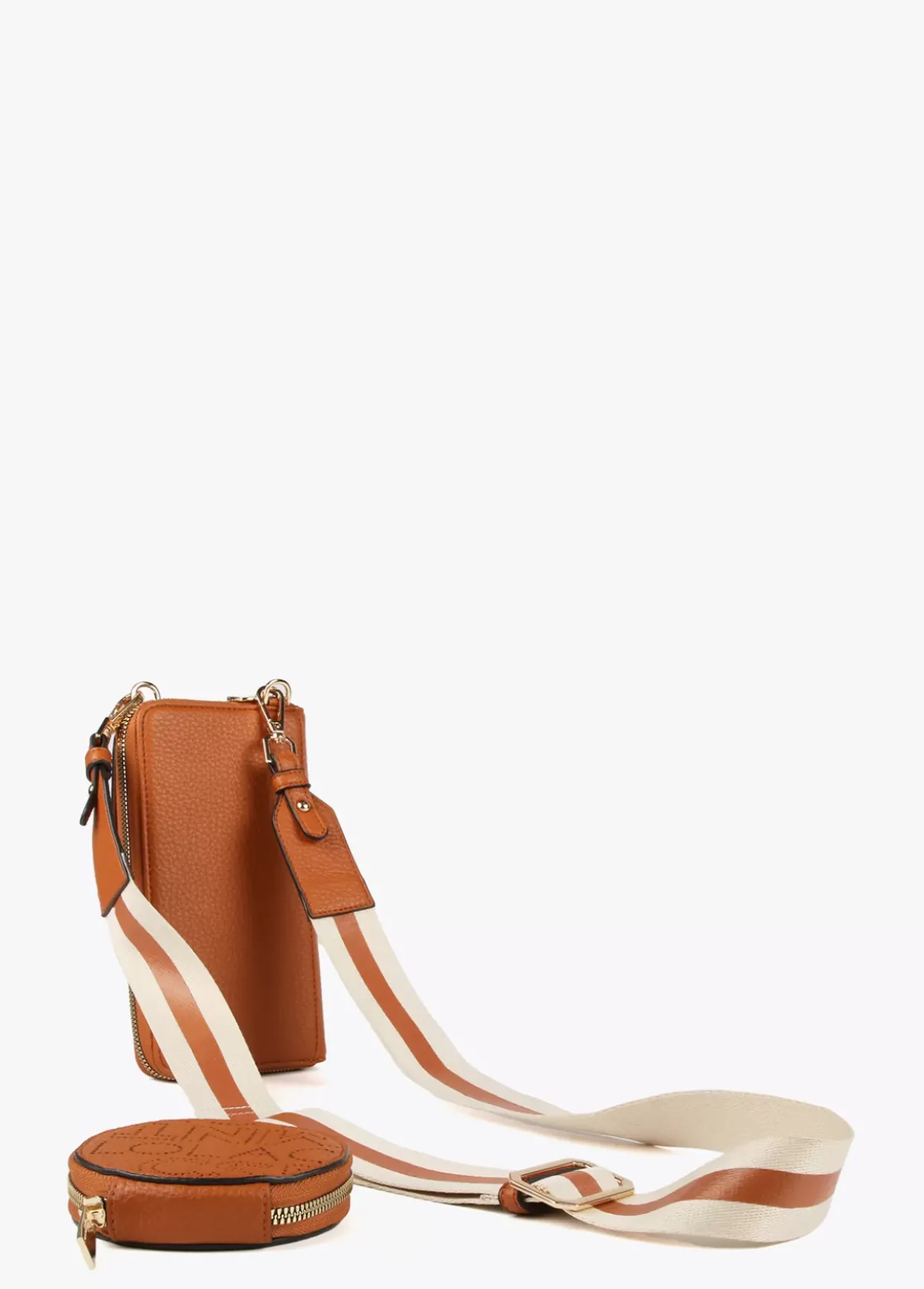 Monedero y bolsito para el móvil con logotipo troquelado y asa bandolera ajustable y extraíble. Detalle monedero en asa bandolera.
