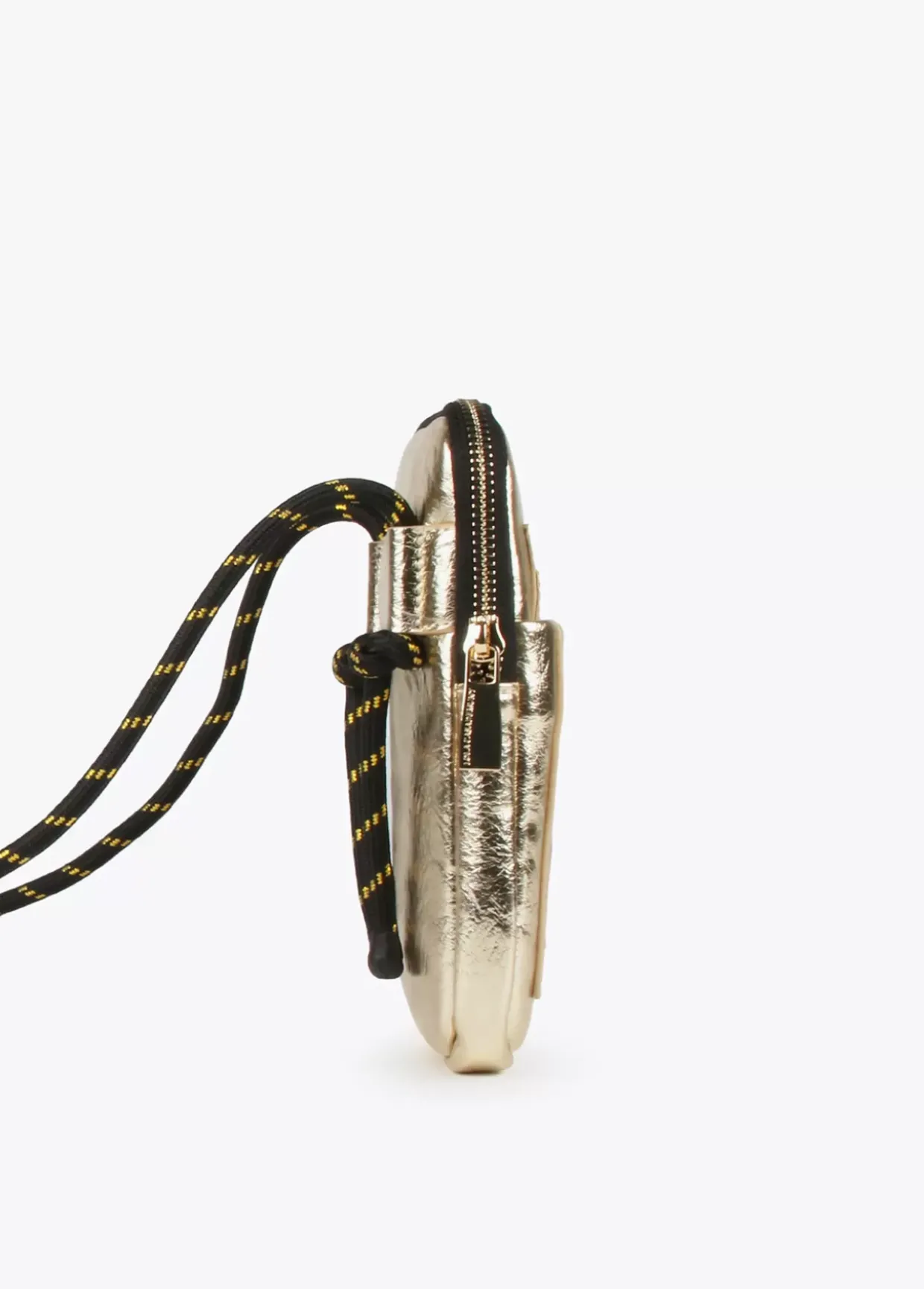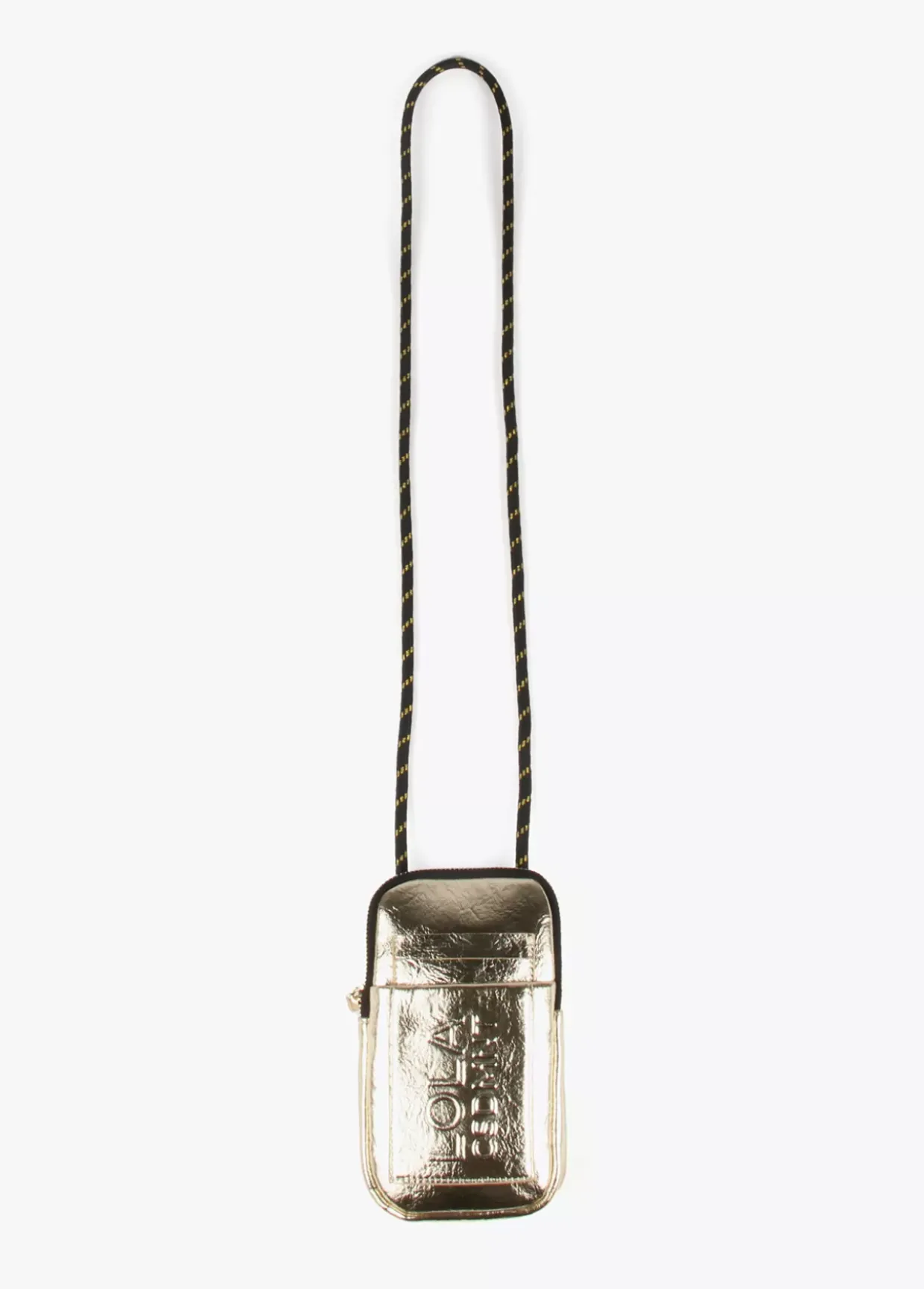 Bolsito porta móvil metalizado con logo grabado en relieve y cierre de cremallera. Asa bandolera de cordón ajustable.