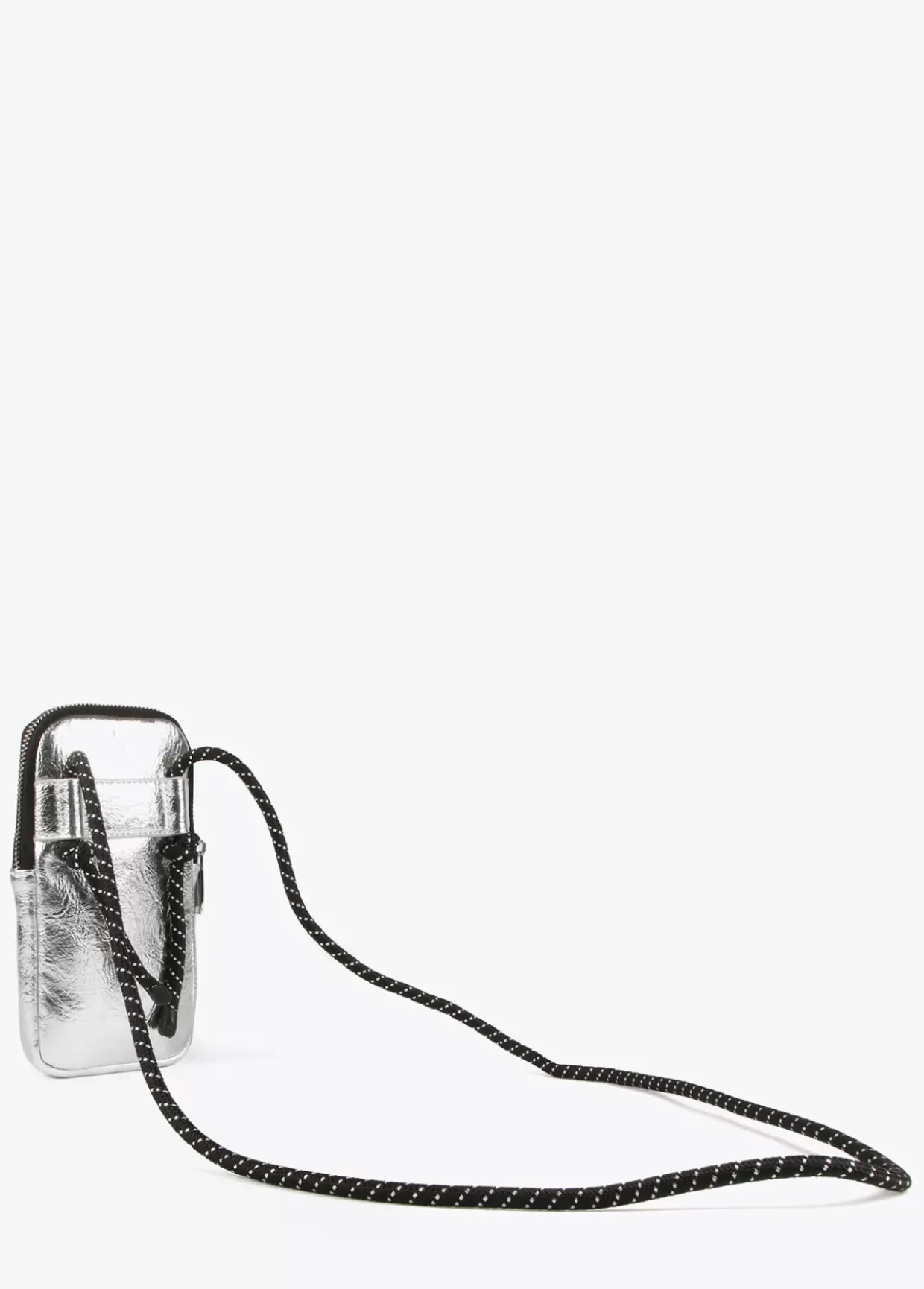 Bolsito porta móvil metalizado con logo grabado en relieve y cierre de cremallera. Asa bandolera de cordón ajustable.