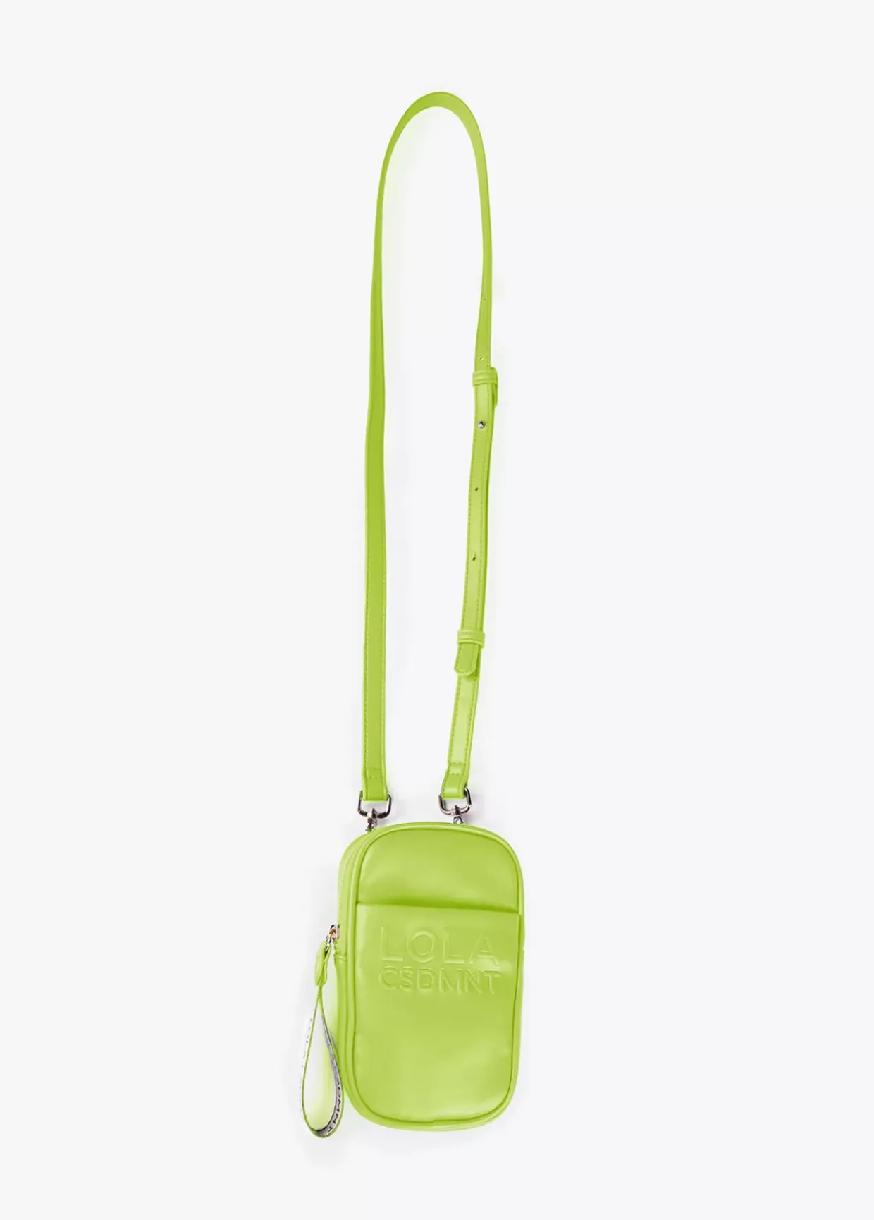 Bolsito portamovil en efecto piel y logo grabado en bolsillo frontal. Cierre de cremallera y asa de mano logotipada. Asa bandolera graduable y extraible.