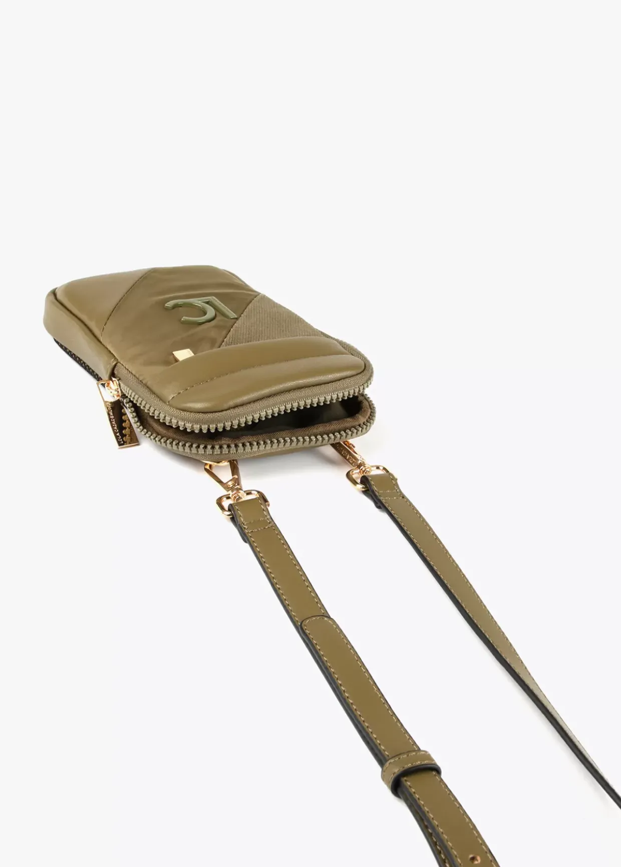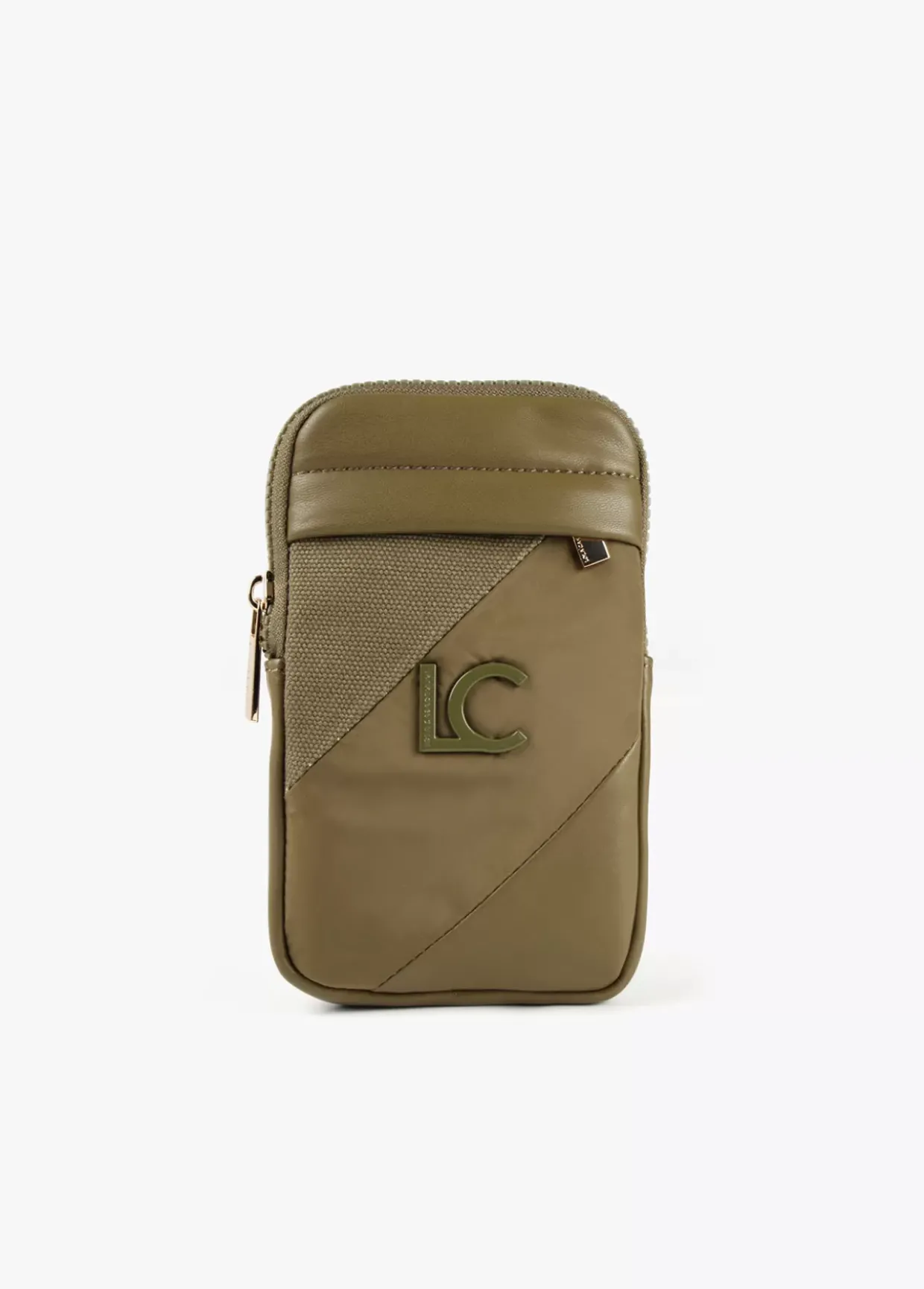 Bolsito portamovil en efecto piel y otros tejidos combinados. Cierre de cremallera, bolsillo exterior con cremallera y trasero de red. Asa bandolera graduable y extraible.