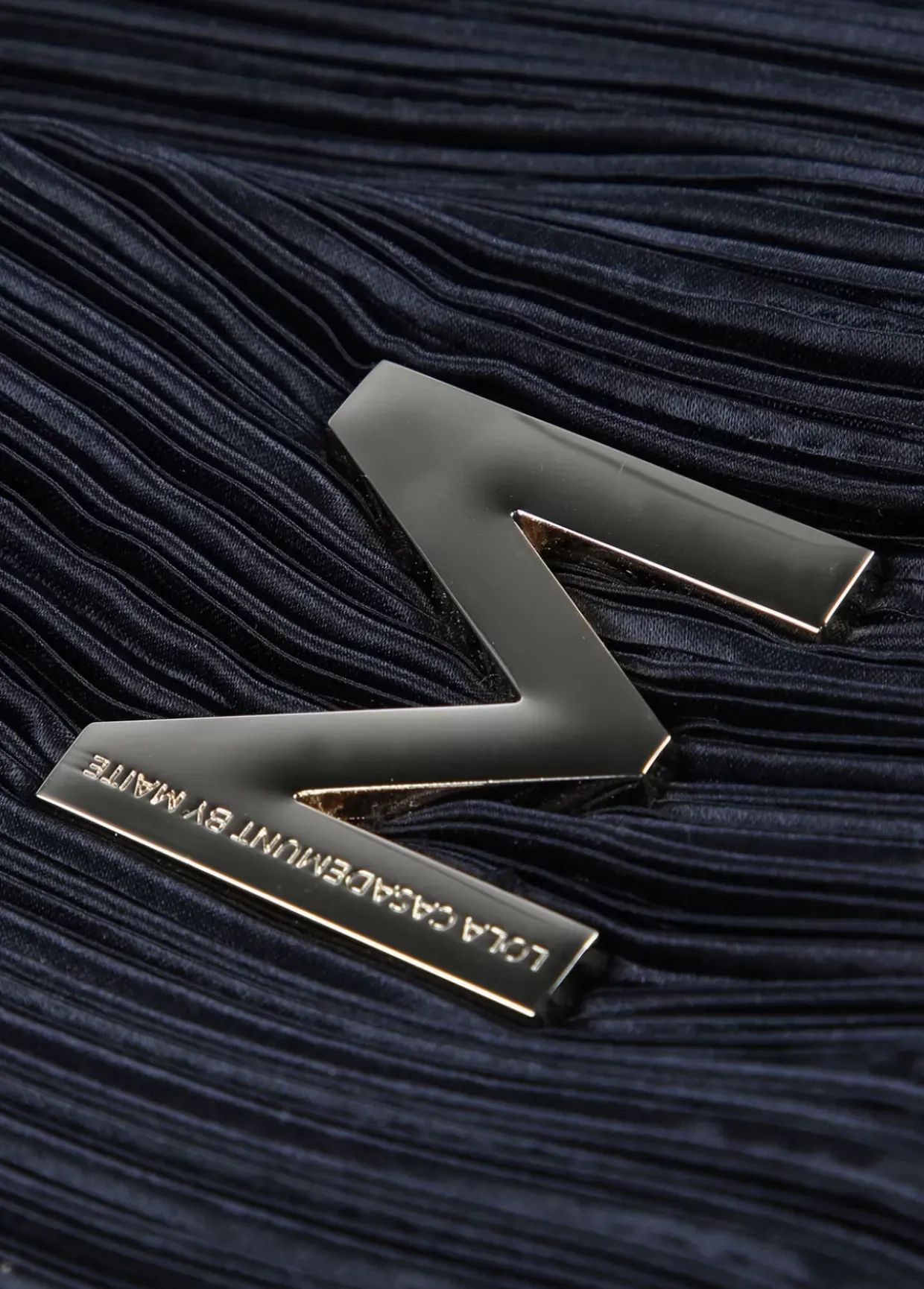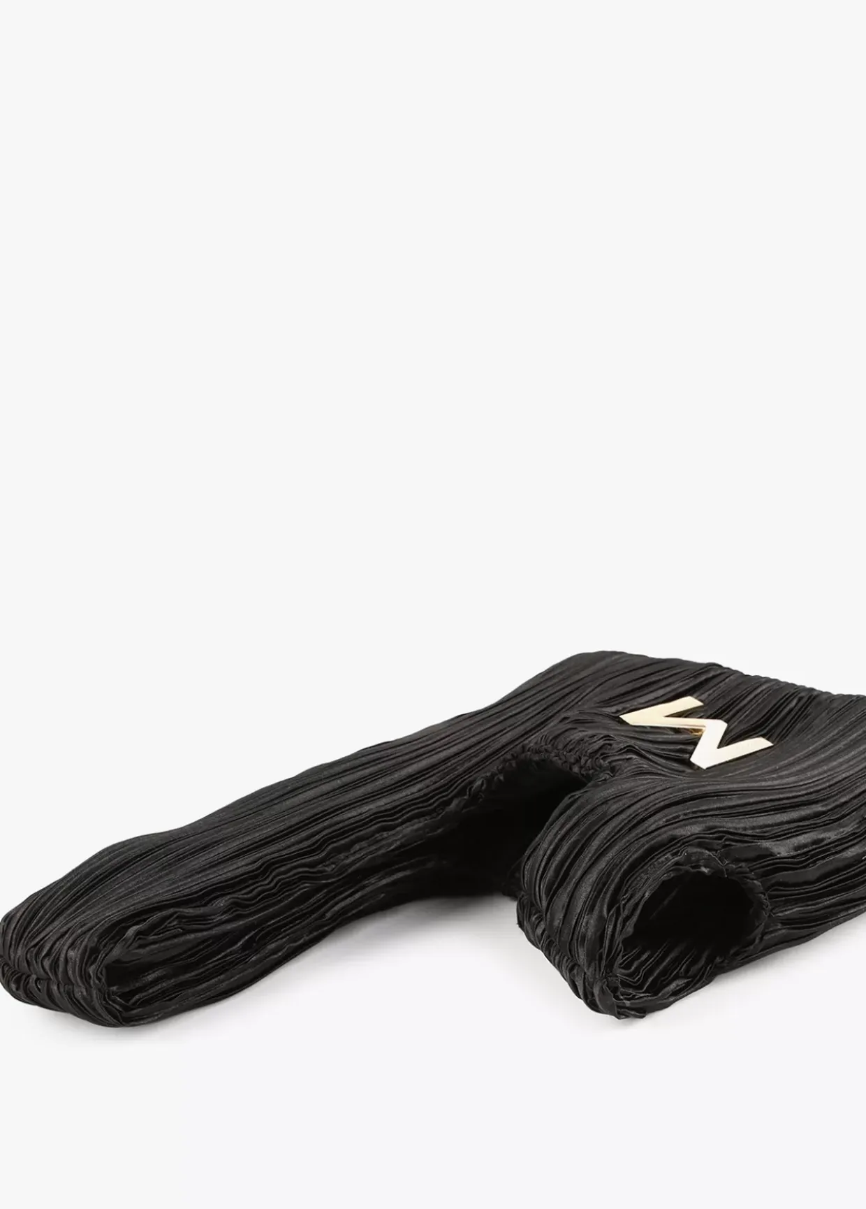 Bolsito de satén plisado con maxi letra M dorada y grabada en parte frontal.