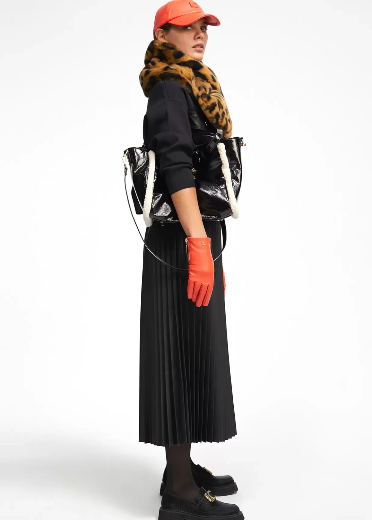 Bolso efecto piel brillante con detalles de borreguito. Asas de hombro y asa bandolera ajustable y extraíble. Logo dorado a modo de cierre con lengüeta.