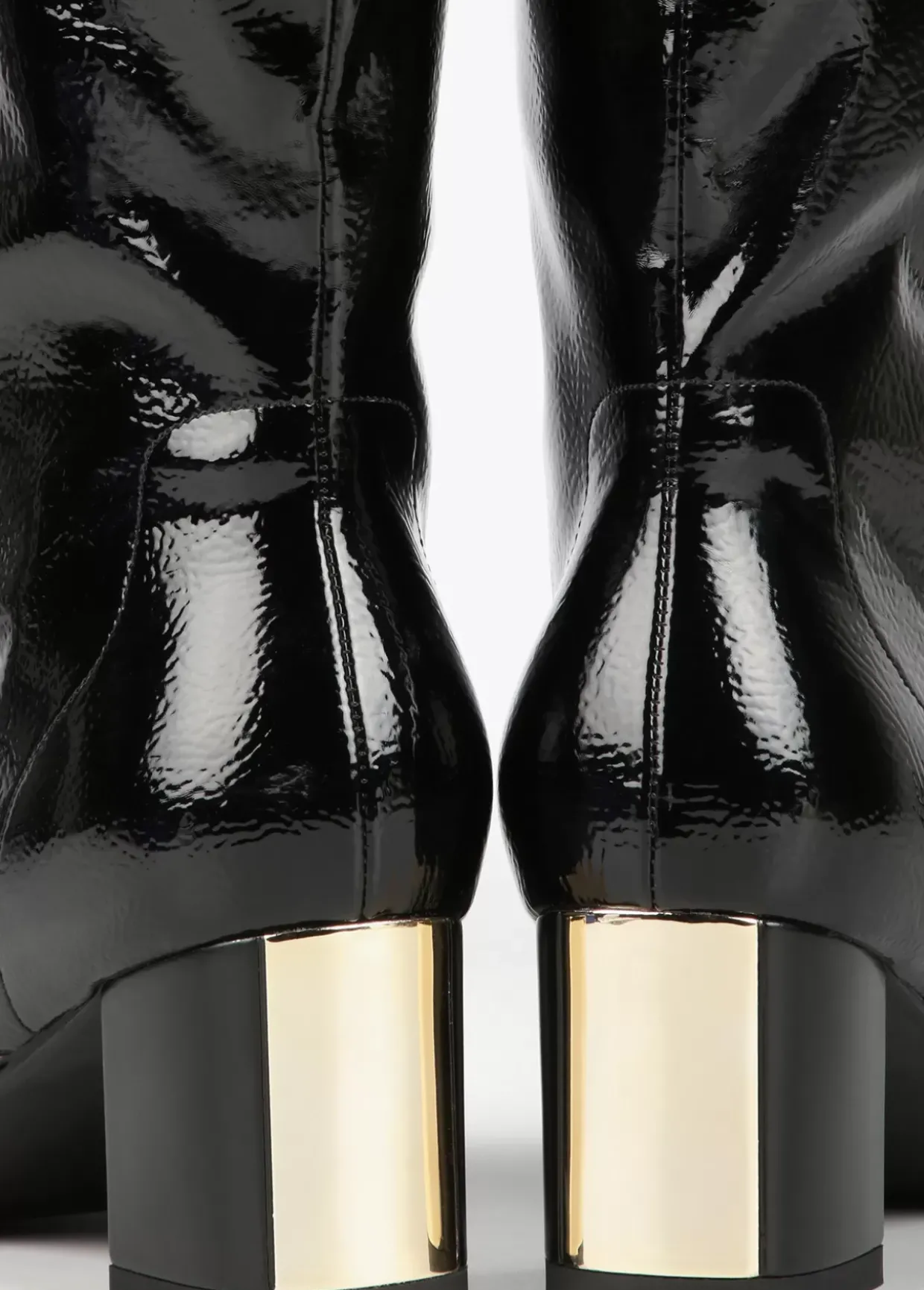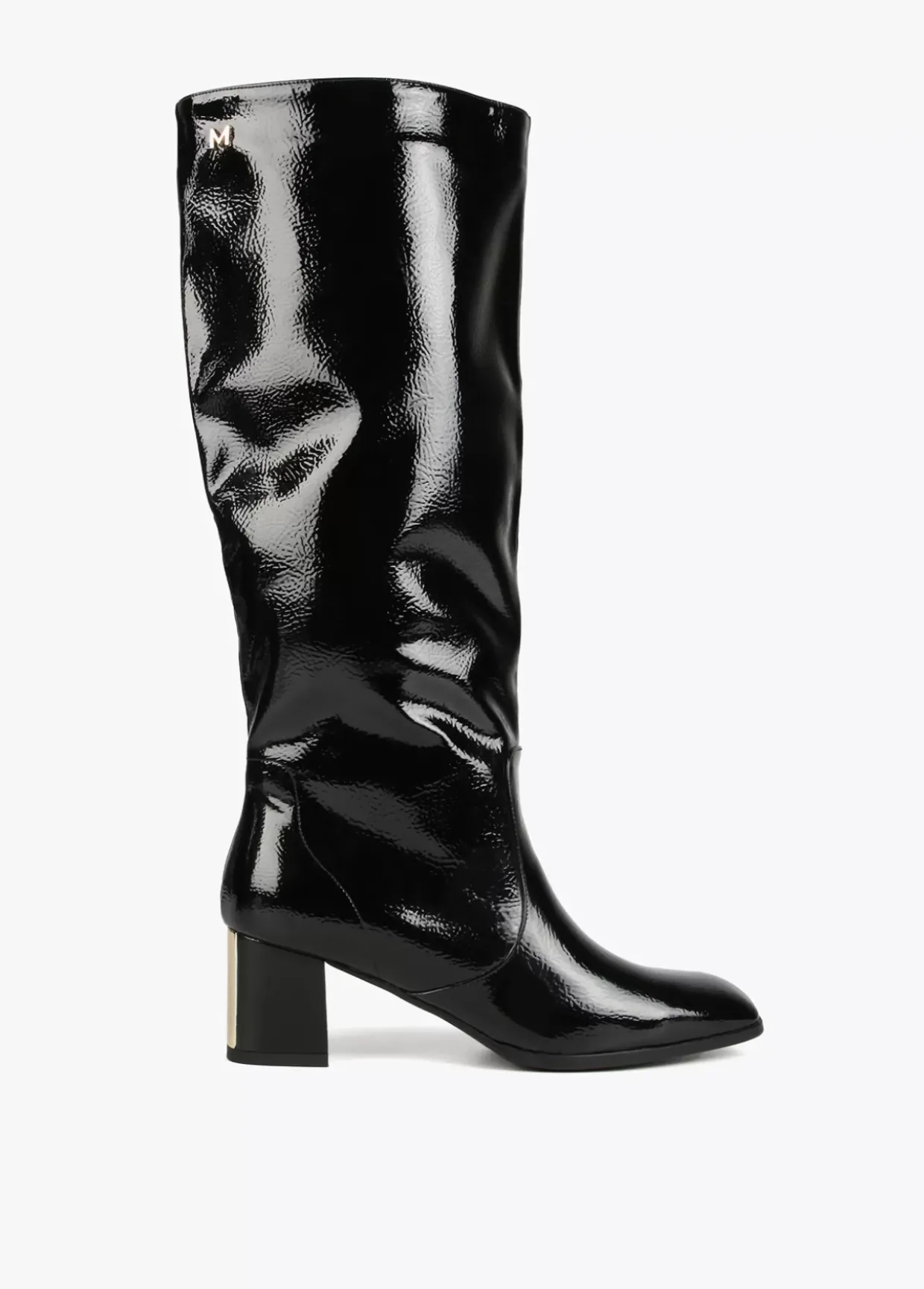 Bota de caña alta en efecto charol con letra logo dorada en el lateral.