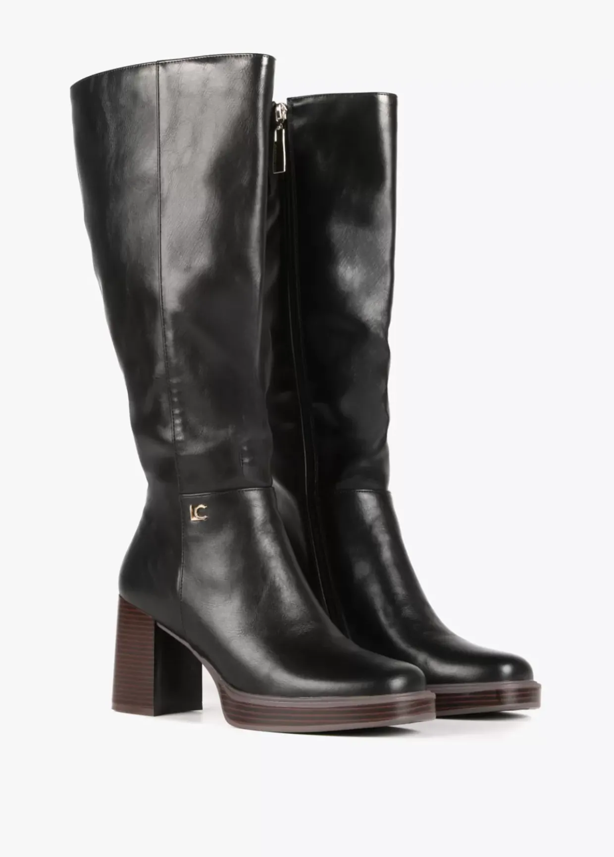 Bota de caña alta con suela de plataforma. Cierre con cremallera en parte interior. Detalle letras logo doradas.
