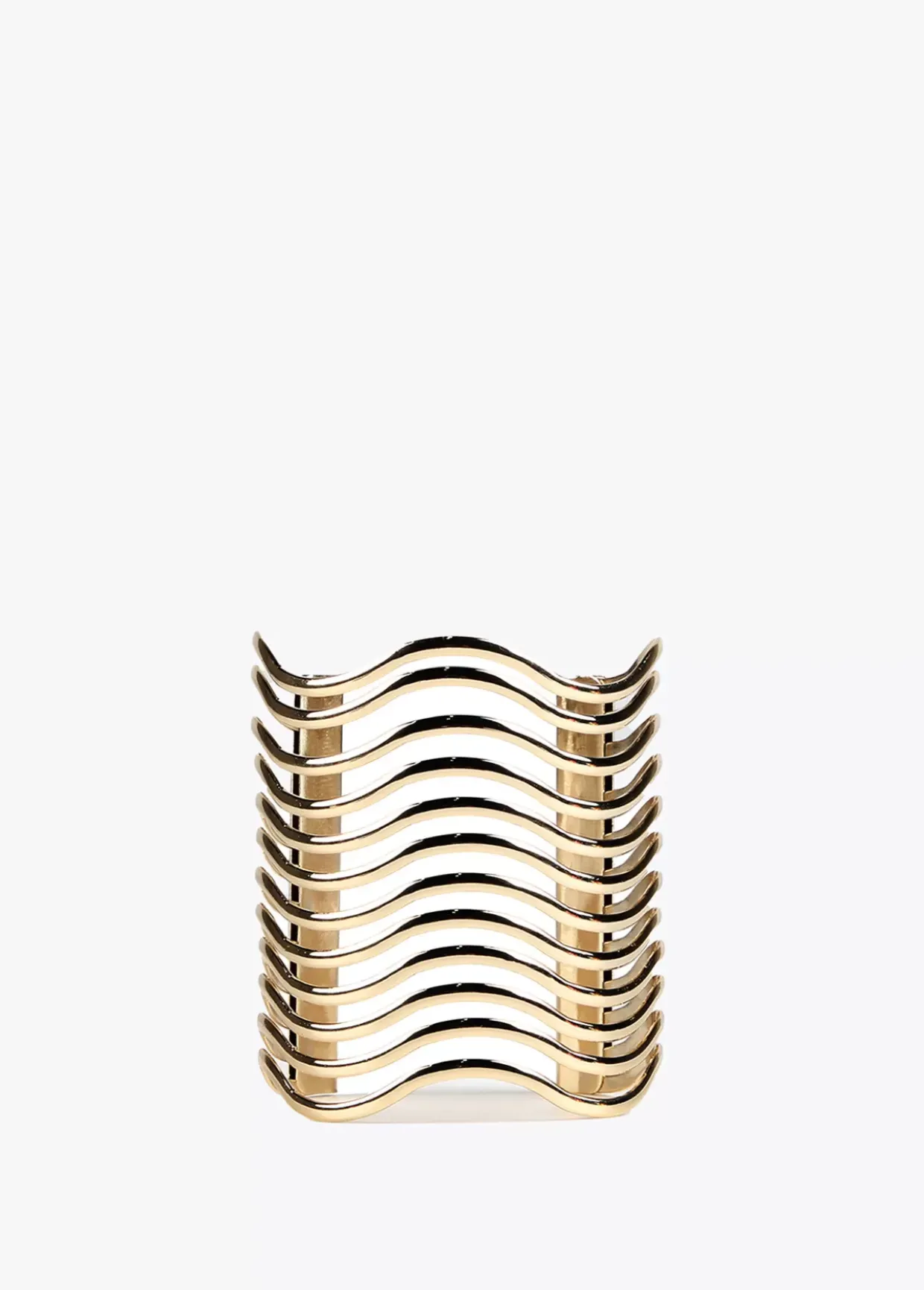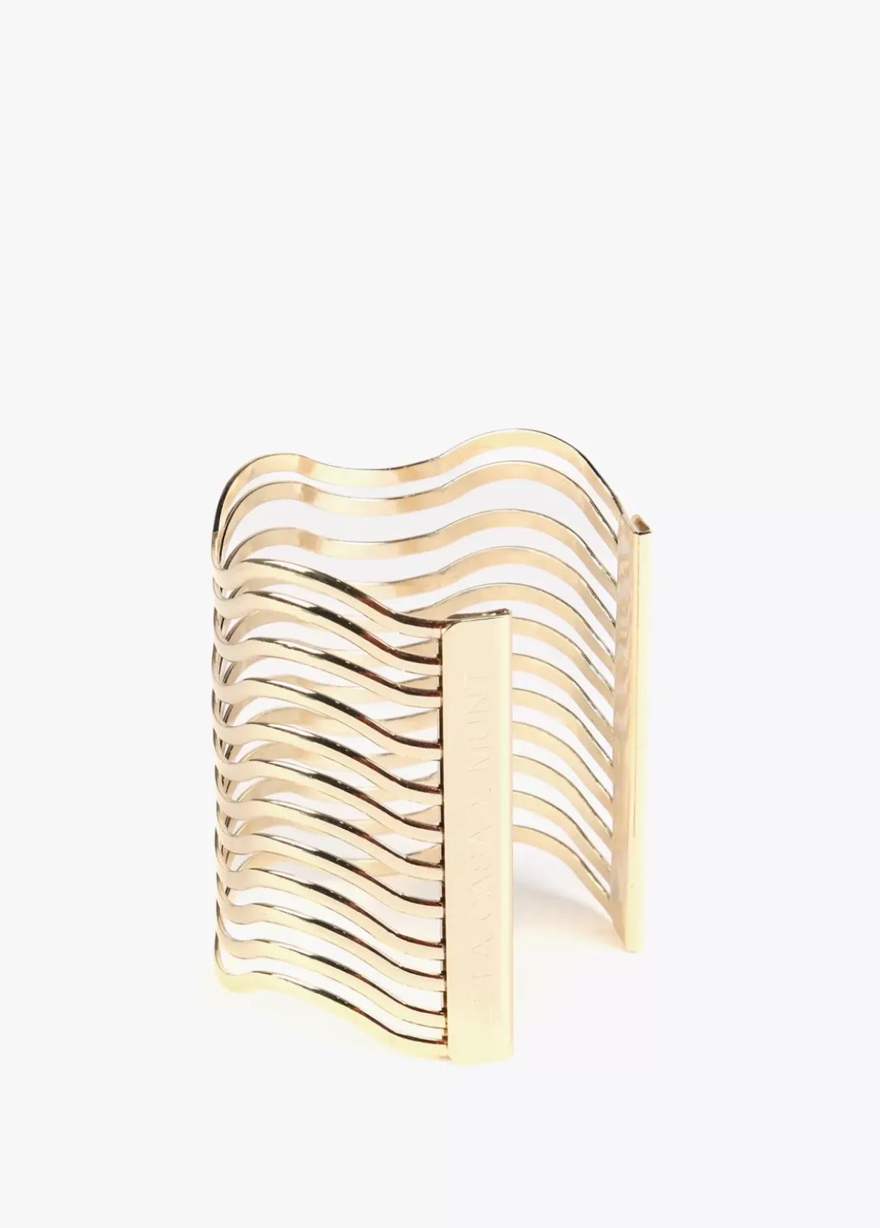Brazalete dorado ancho de ondas con logtoipo grabado.