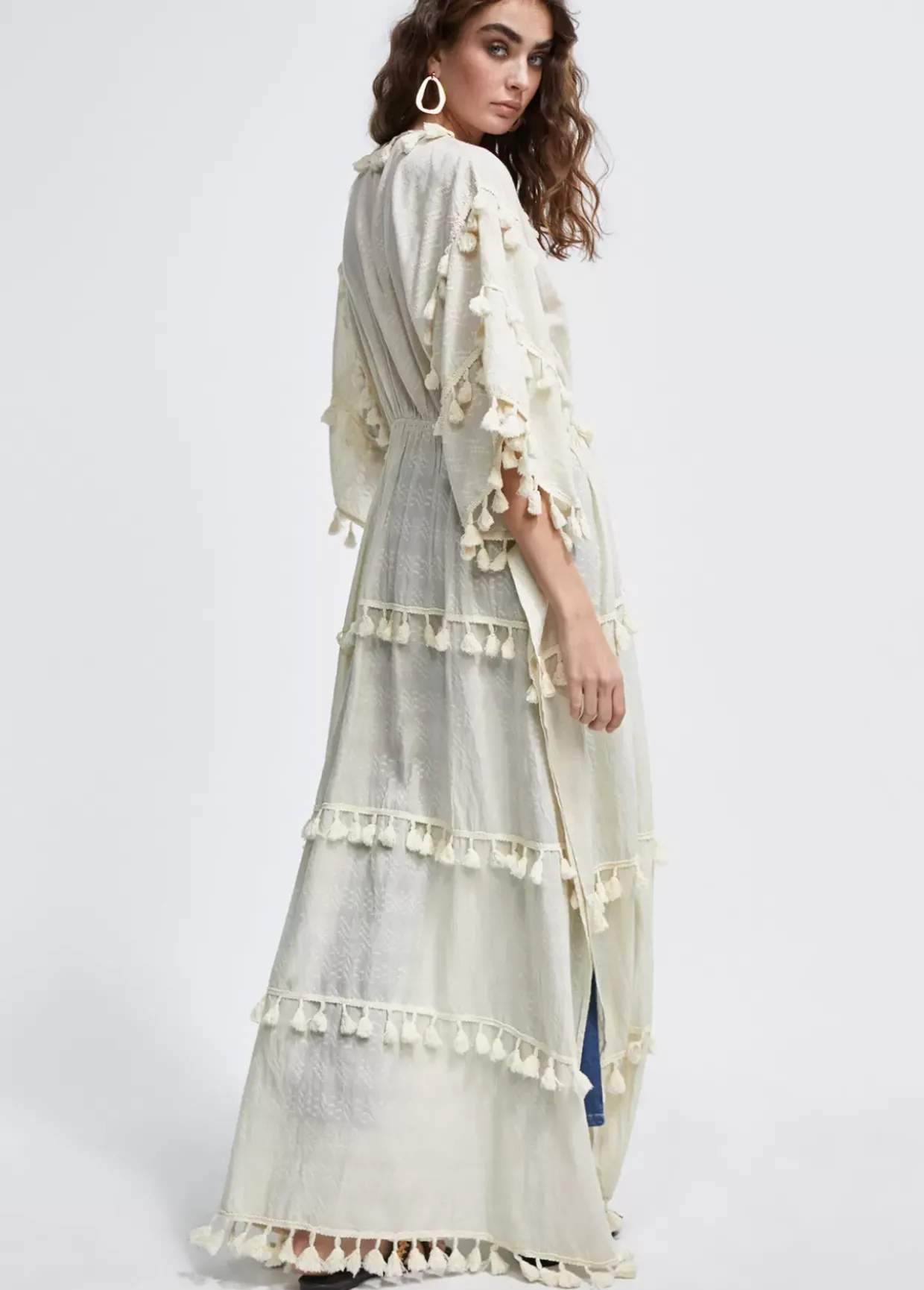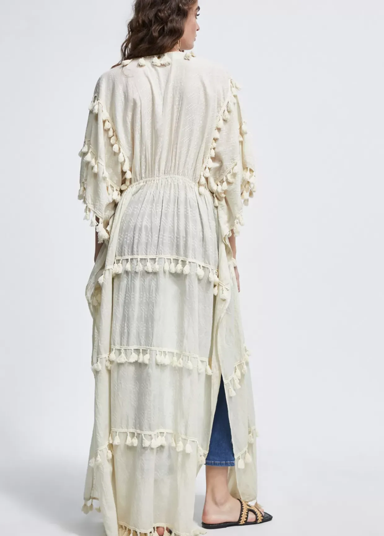 Caftan largo monocolor. Abierto. Pompones a tono. Aberturas laterales.