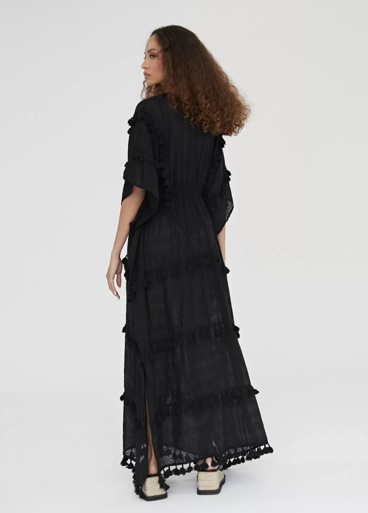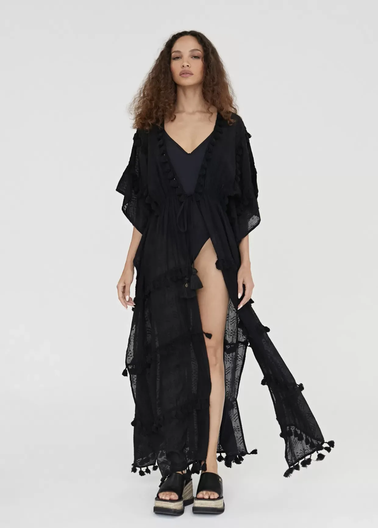 Caftan largo monocolor. Abierto. Pompones a tono. Aberturas laterales.