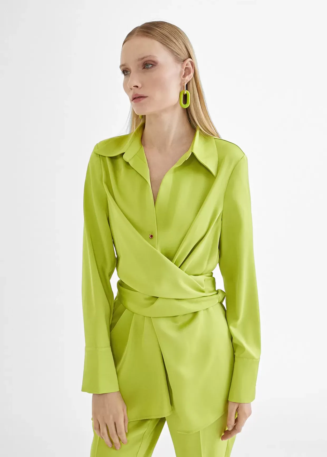 Camisa larga anudada en cintura o en parte trasera. Botones joya en puños y en tapeta frontal.