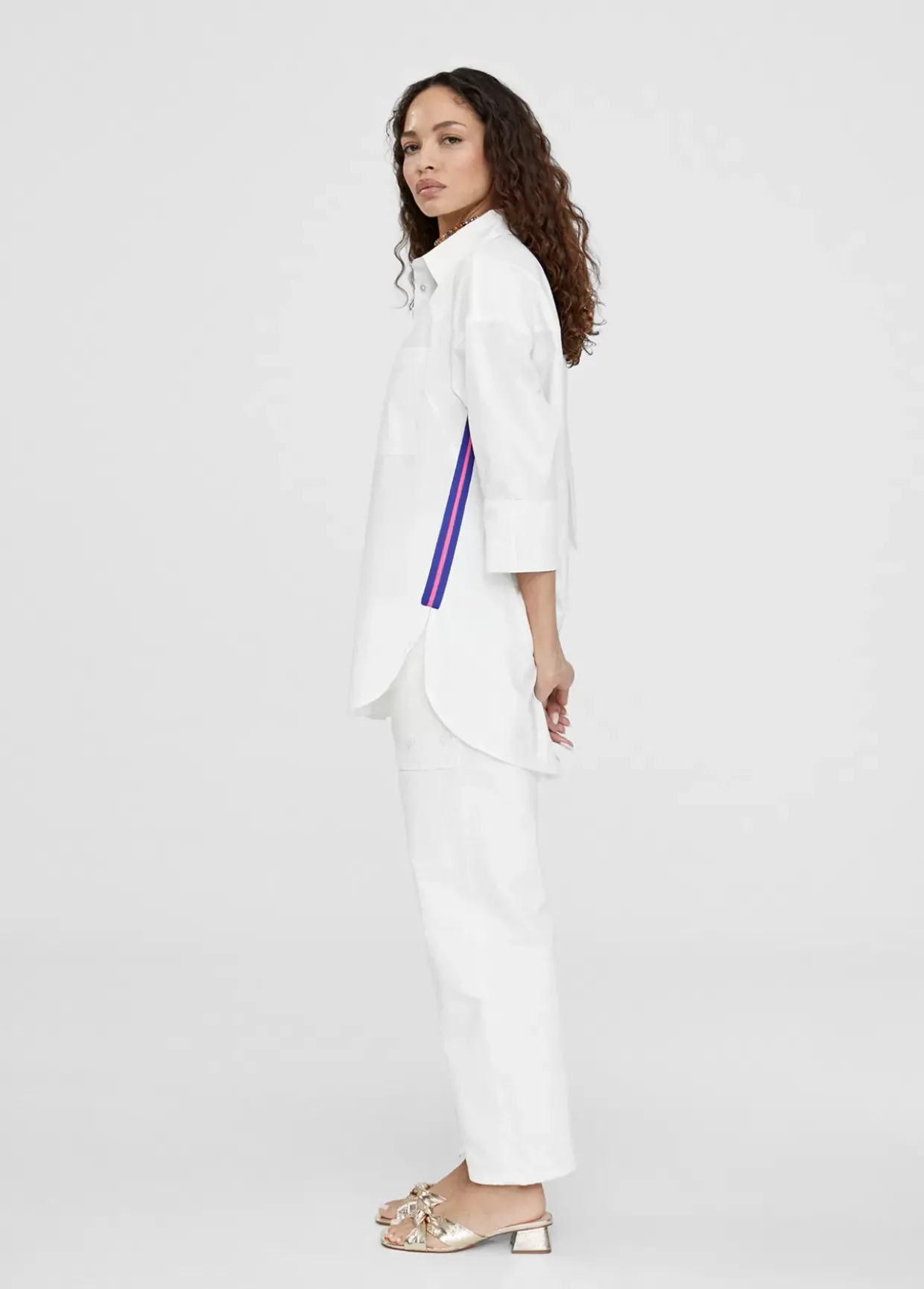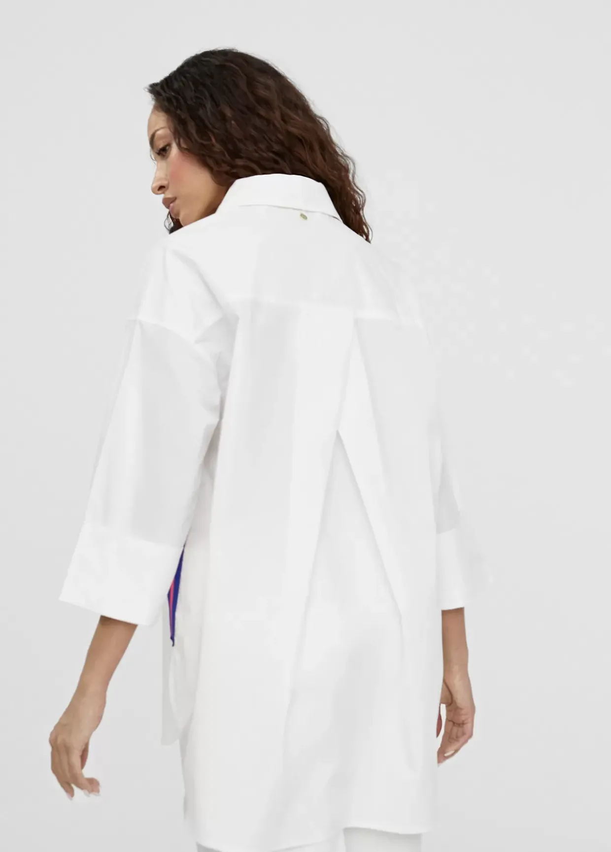 Camisa amplia de cuello y puños camiseros. Único bolsillo plastrón en pecho. Banda lateral bicolor con aberturas.