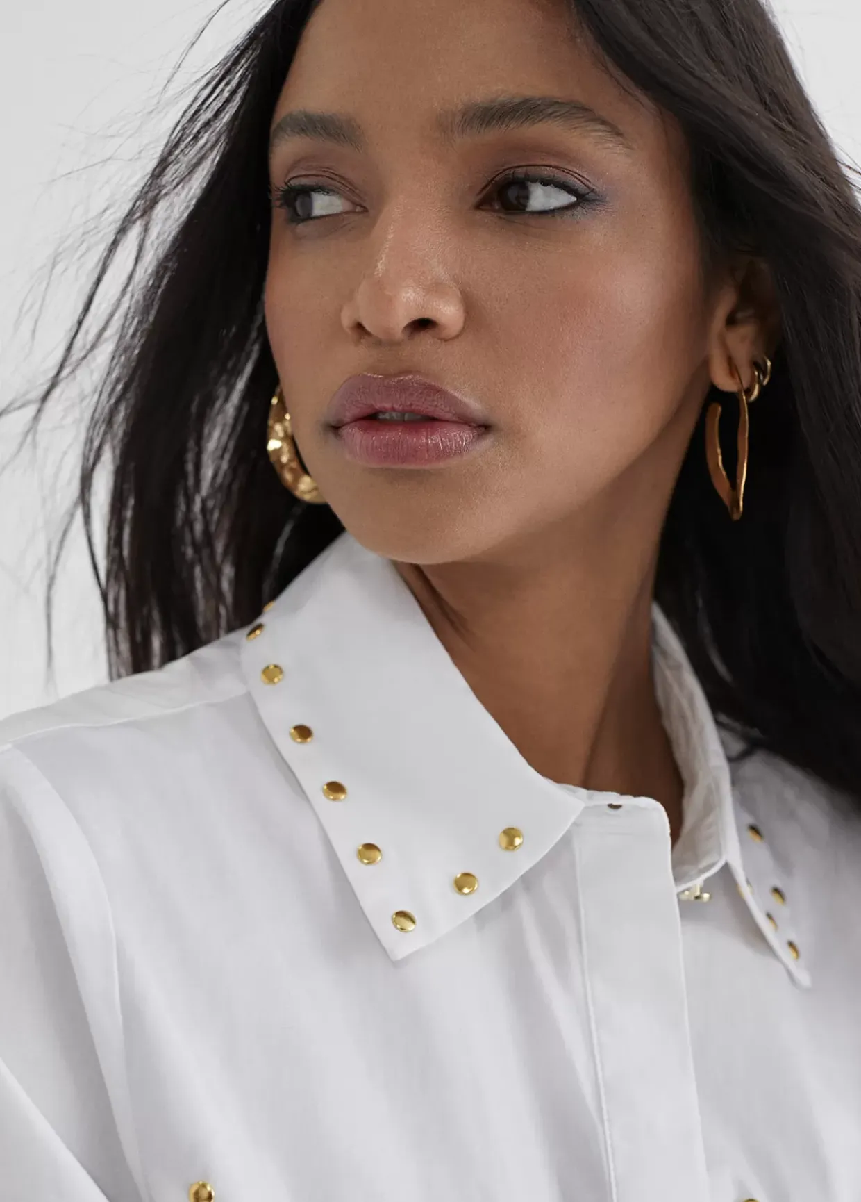 Camisa amplia de popelín con abalorios tipo joya. Cuello y puños camisero y cierre con tapeta oculta.