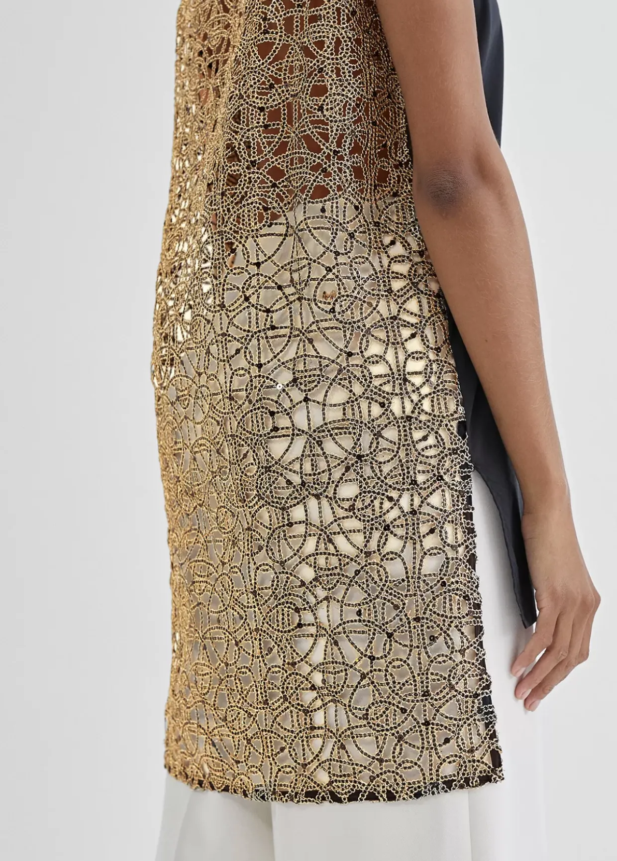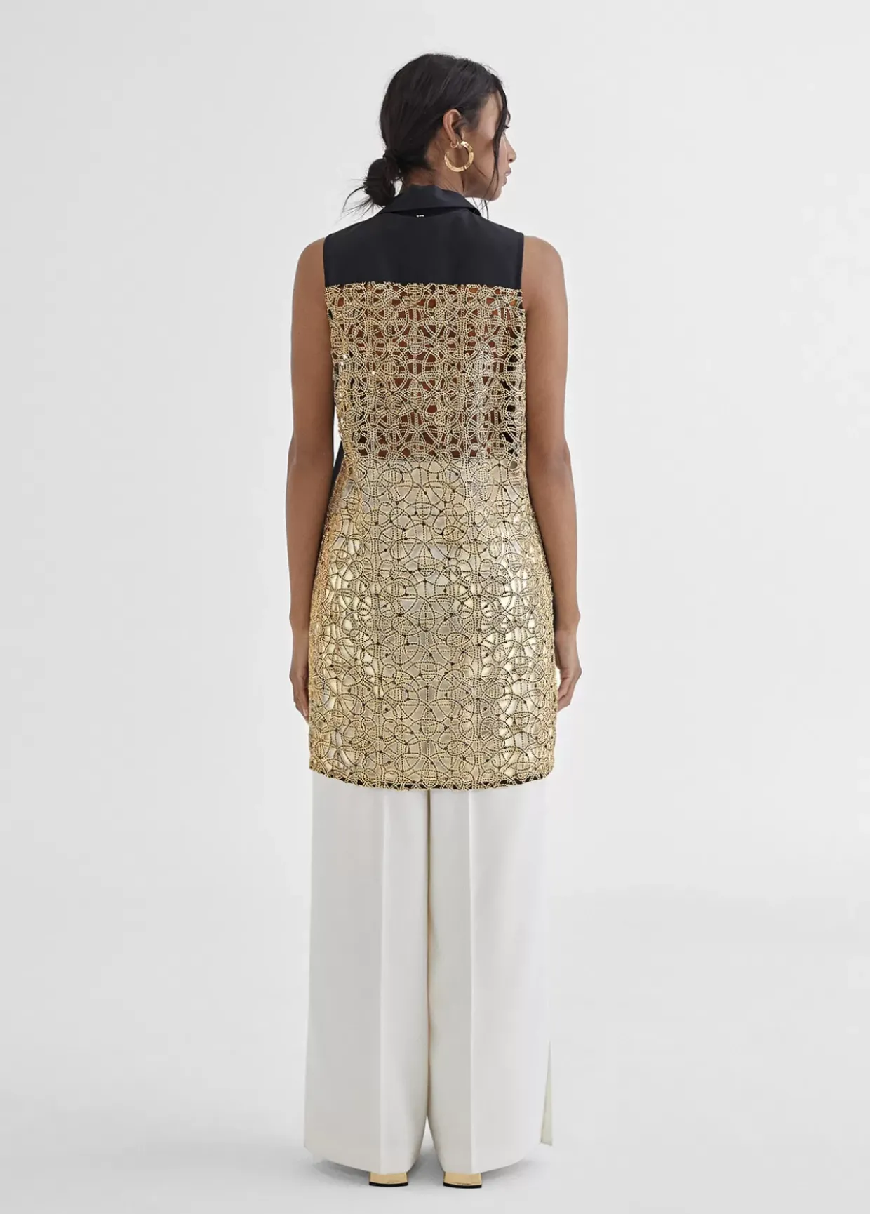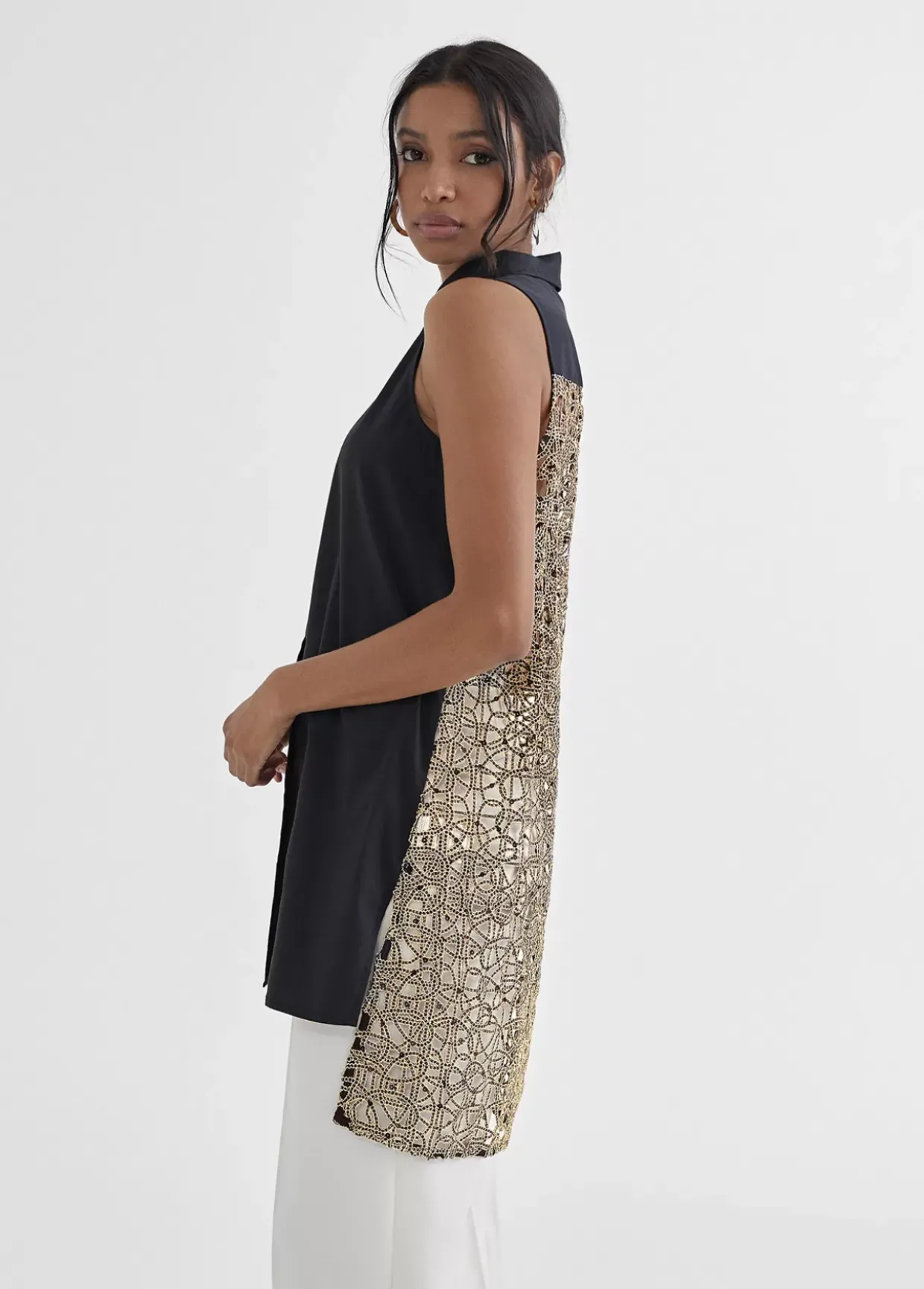 Camisa larga sin mangas. Frontal de popelín. Bordado fantasía dorada en espalda, semitrasparente. Cuello camisero. Tapeta oculta y aberturas laterales.