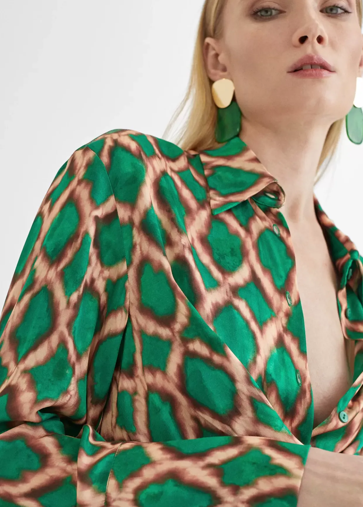 Camisa con estampado animal y lazada en cintura. Cuello camisero y botones al tono.
