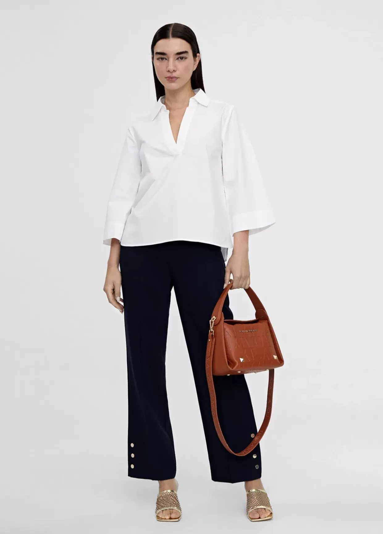 Camisa blanca con manga tres cuartos acampanada y logo a contraste en espalda. Cuello con solapa y pico sin botones.