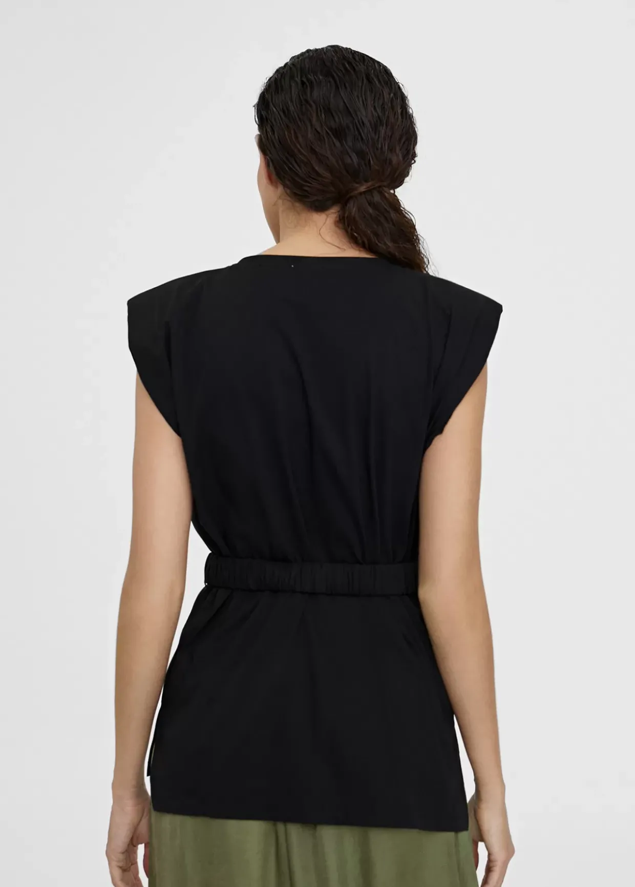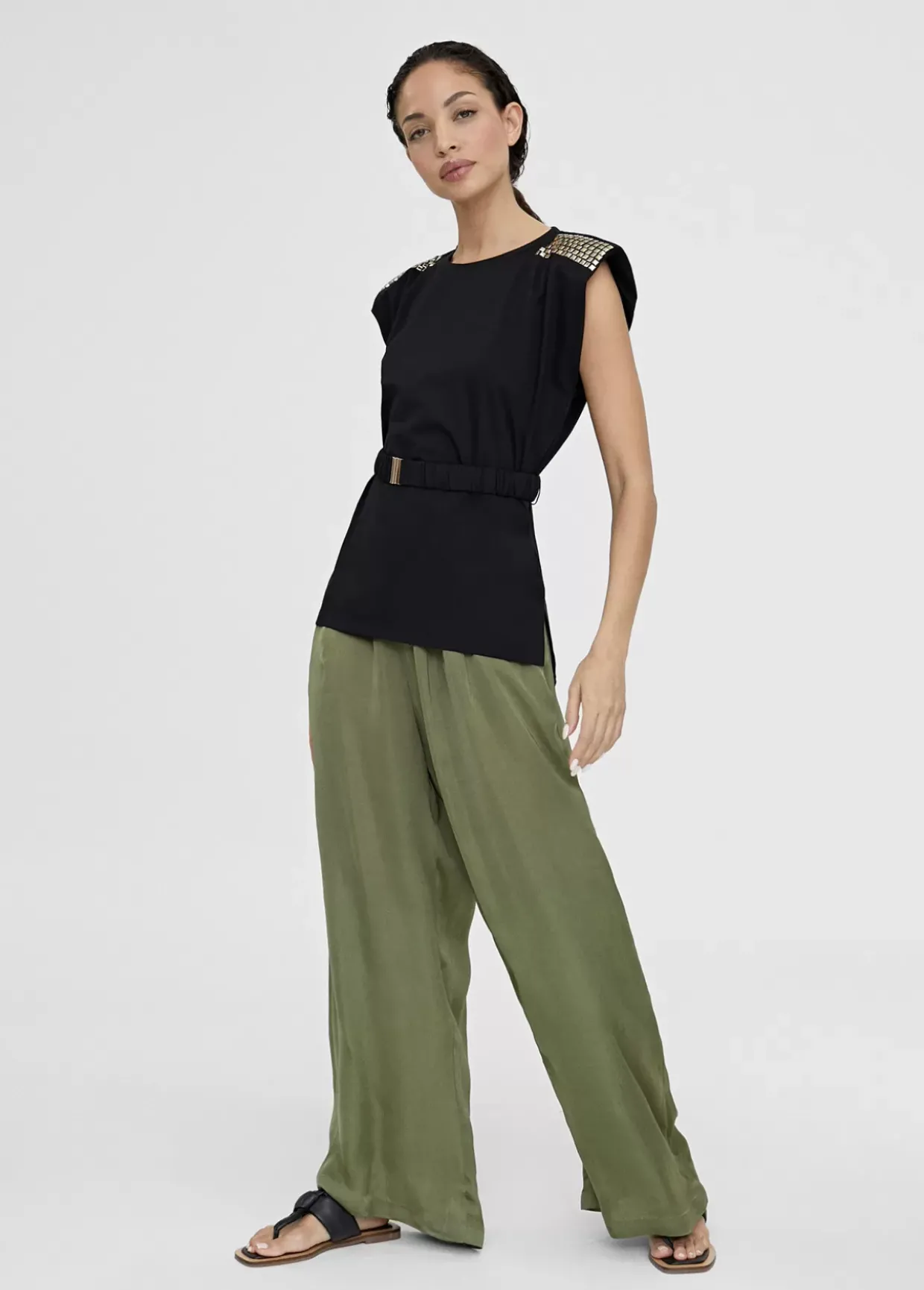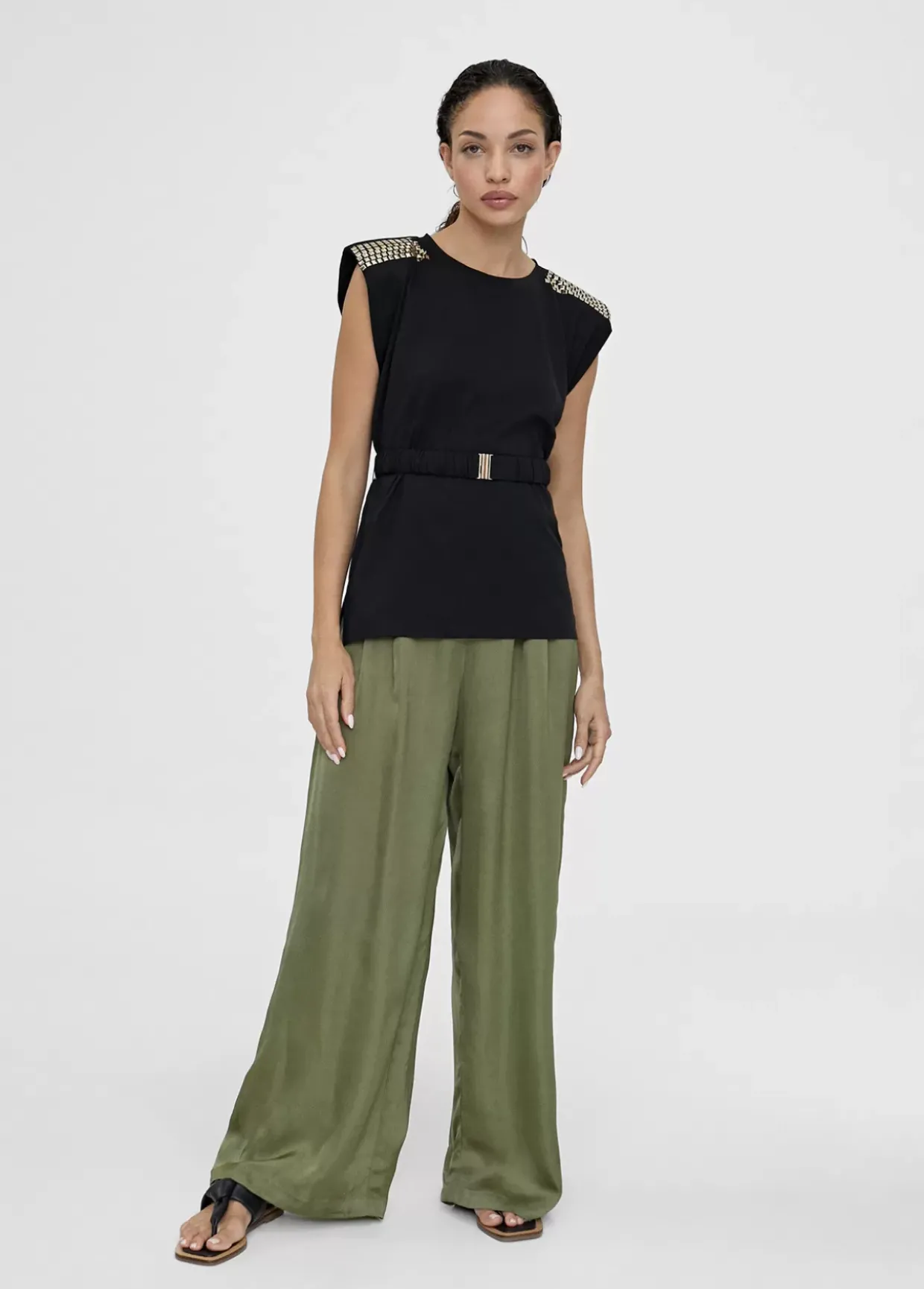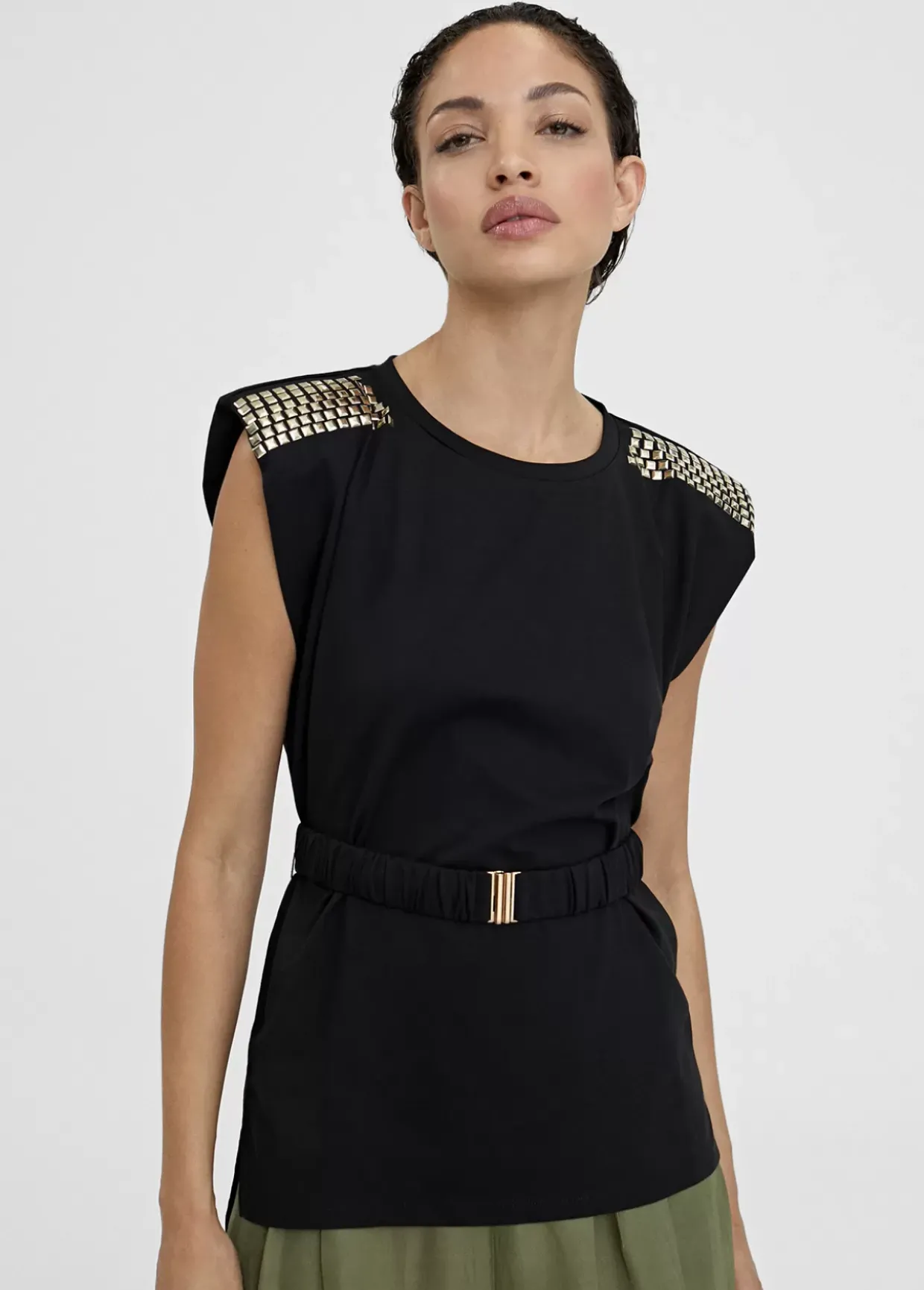 Camiseta cuello caja con manga sisa y hombreras con piezas doradas. Cinturón elástico del mismo tejido y color con hebilla metálica.