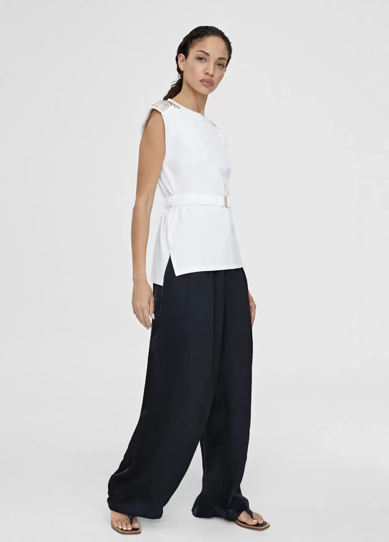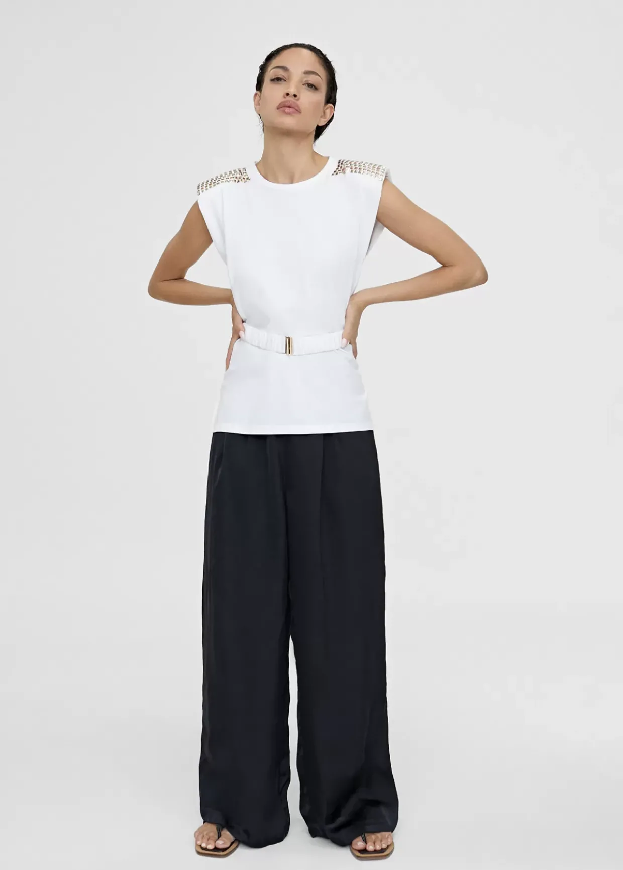 Camiseta cuello caja con manga sisa y hombreras con piezas doradas. Cinturón elástico del mismo tejido y color con hebilla metálica.