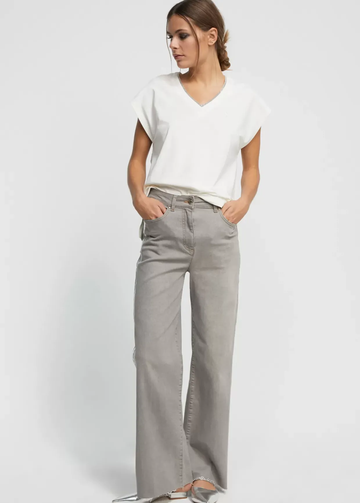Camiseta en cuello pico y manga sisa. Detalle de cadena mini en cuello.