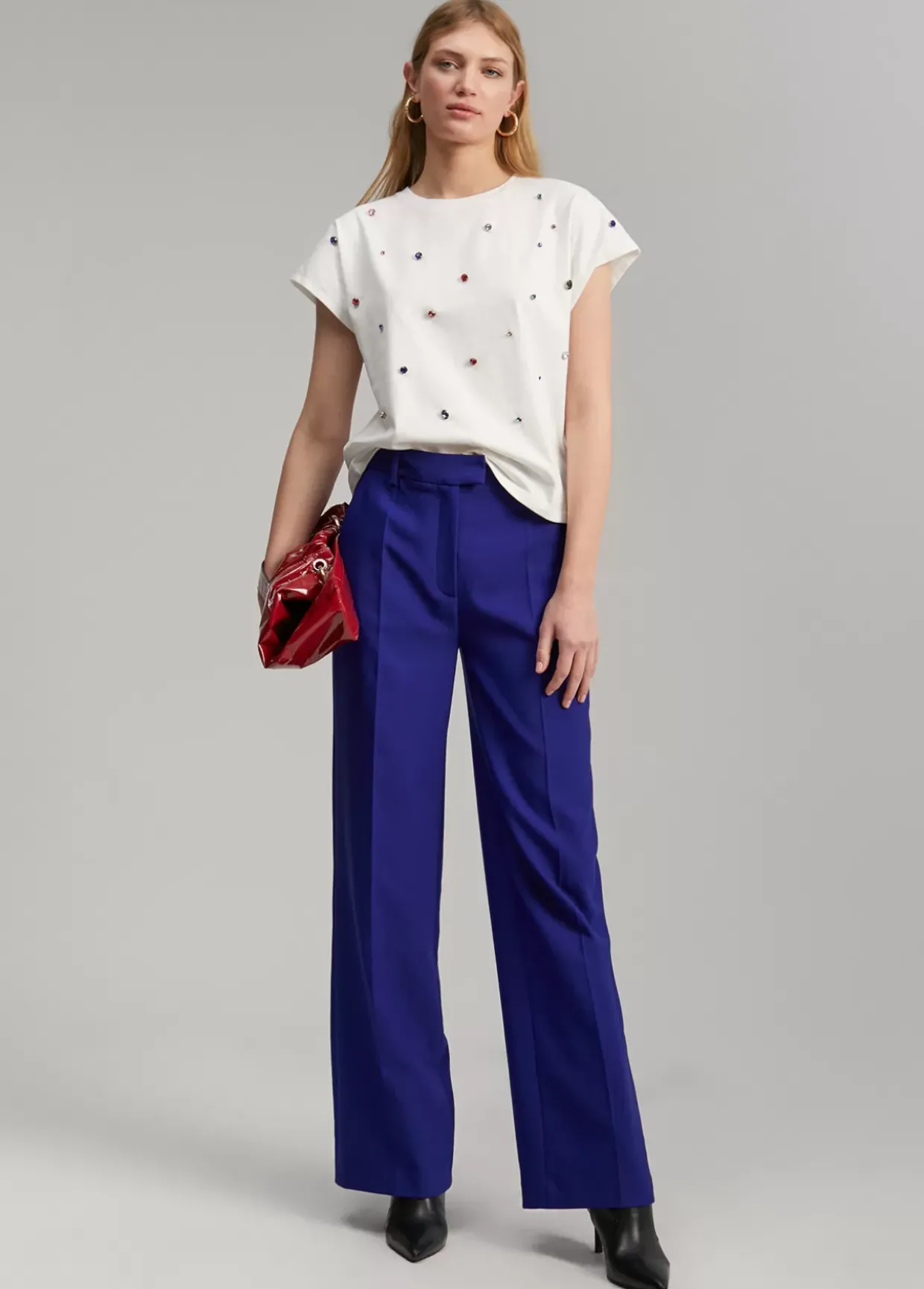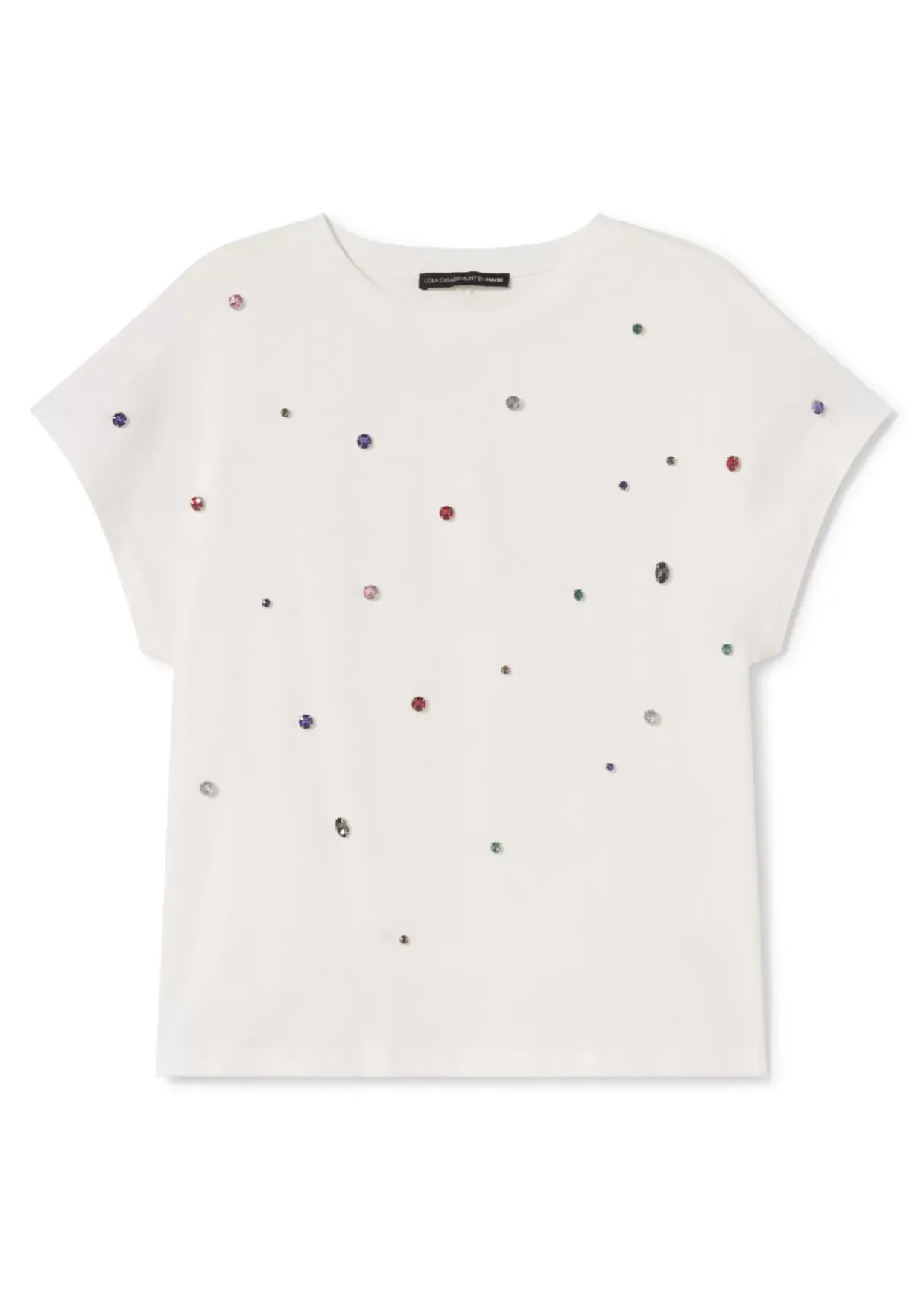 Camiseta recta de manga corta y cuello caja. Detalle de joyas multicolor en frontal.