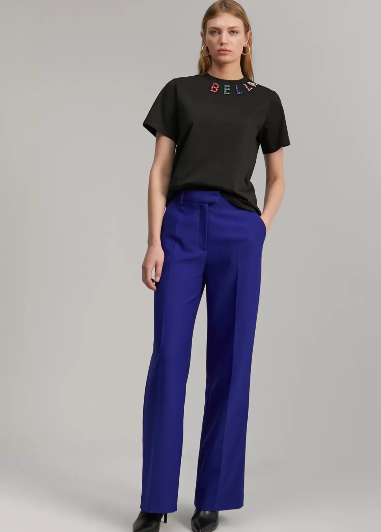 Camiseta de manga corta y cuello caja. Detalle BELLA en pedrería contrastada.