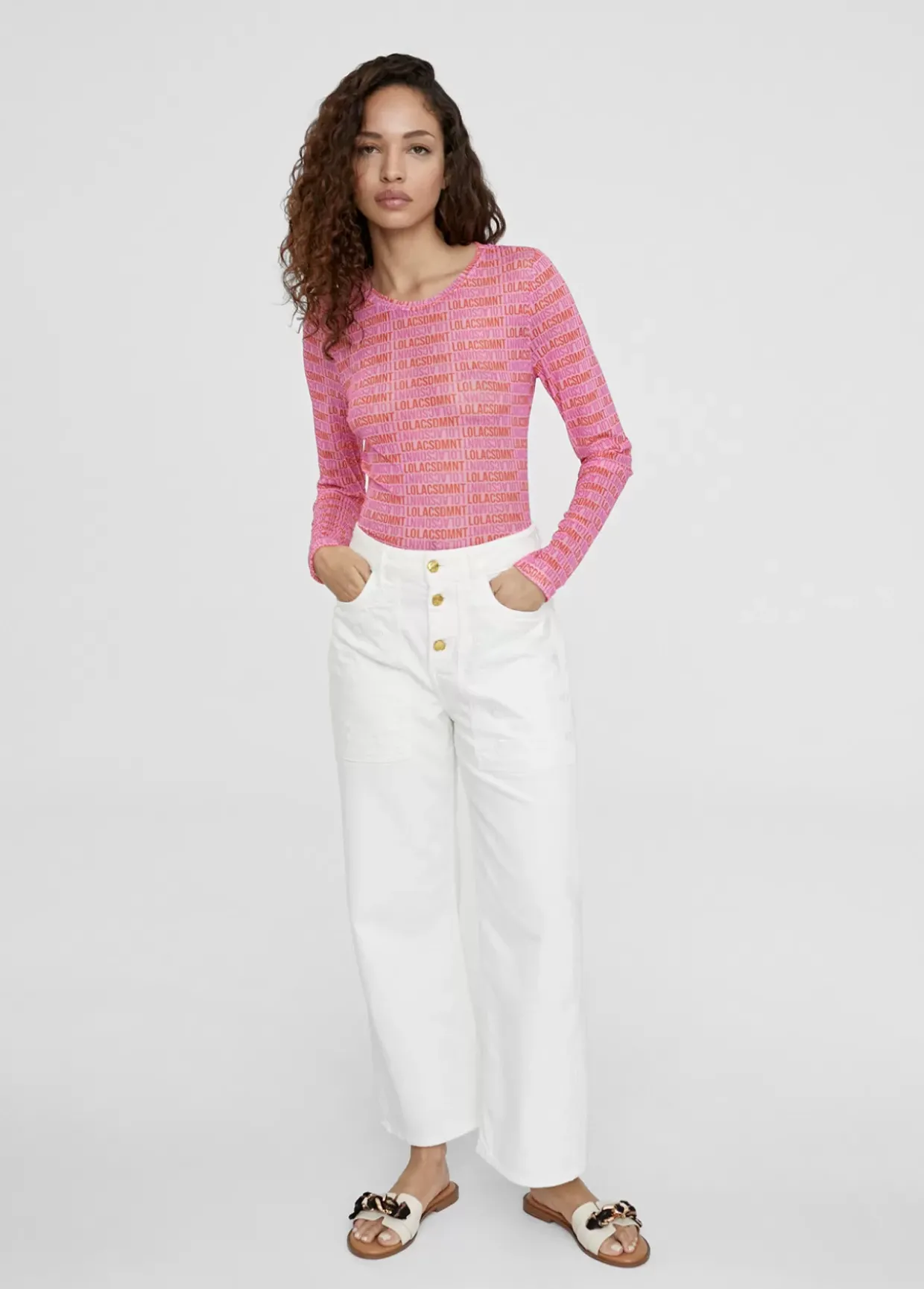 Camiseta en cuello caja y manga larga. Tejido semi transparente estampado monograma a color.