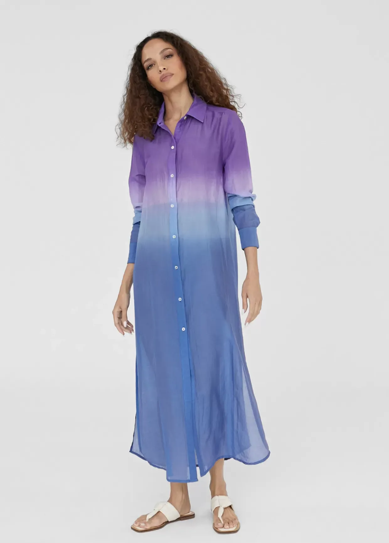 Camisola larga en estampado tie dye. Cuello y puños camiseros. Cierre delantero con botones. Aberturas laterales.