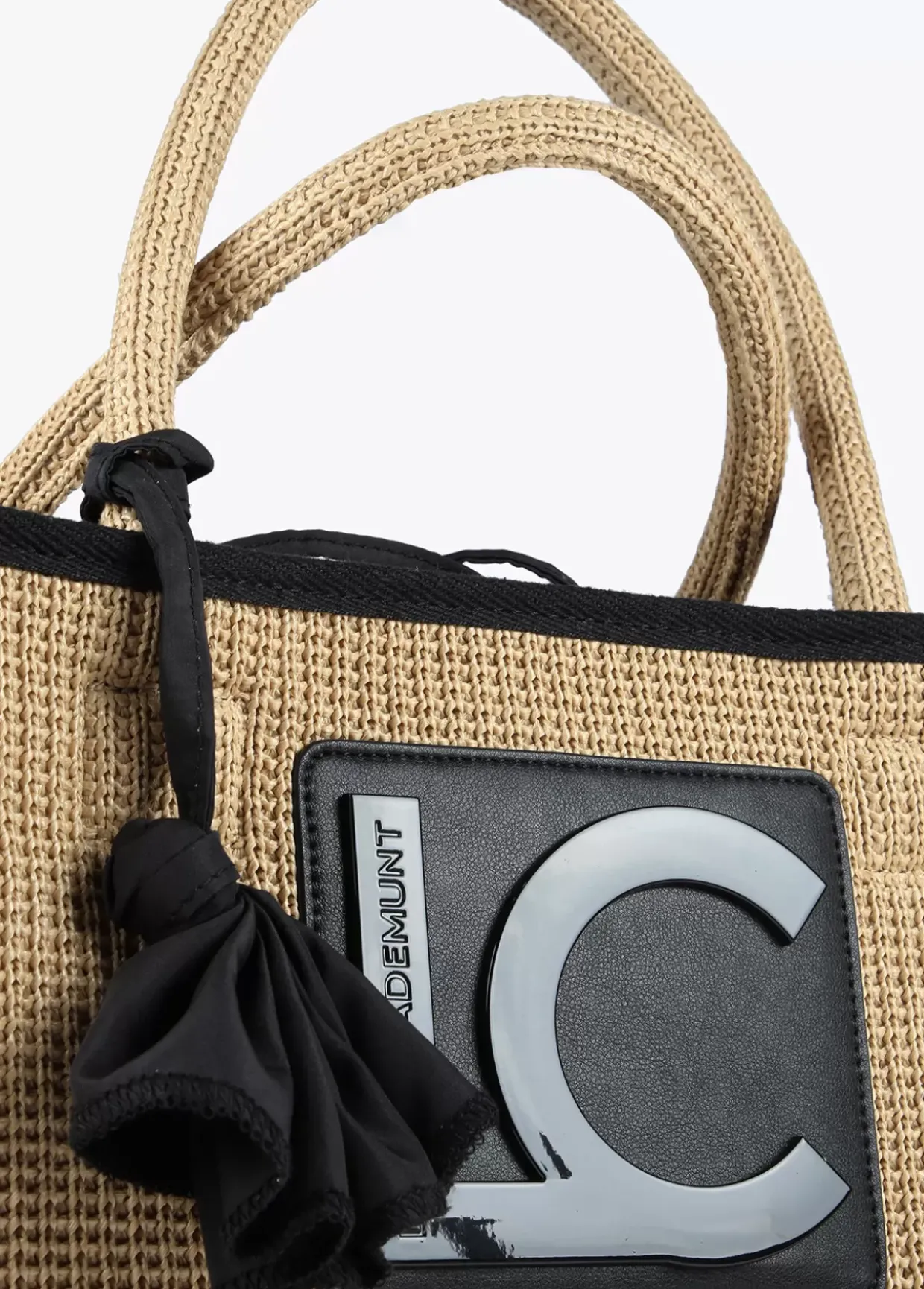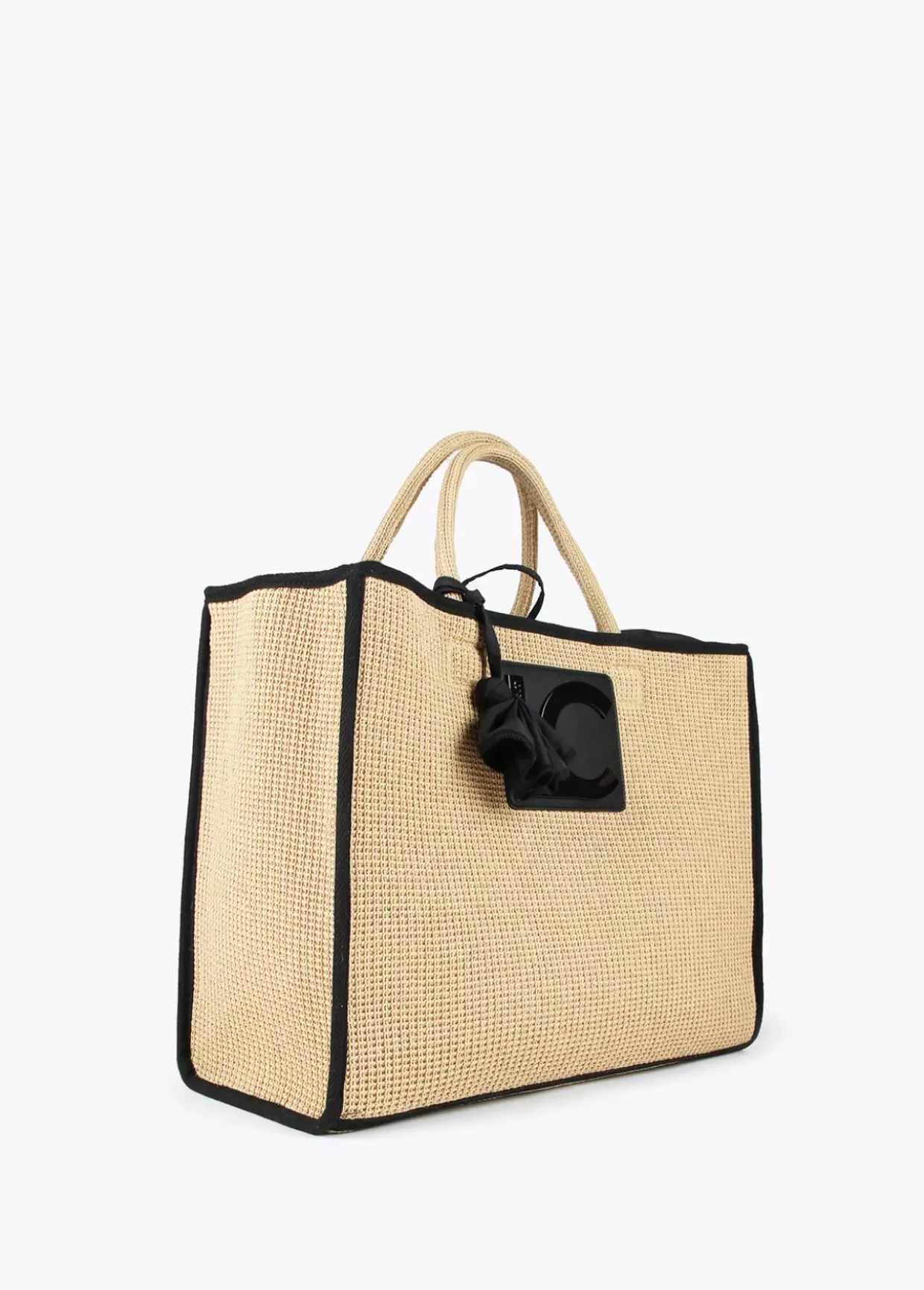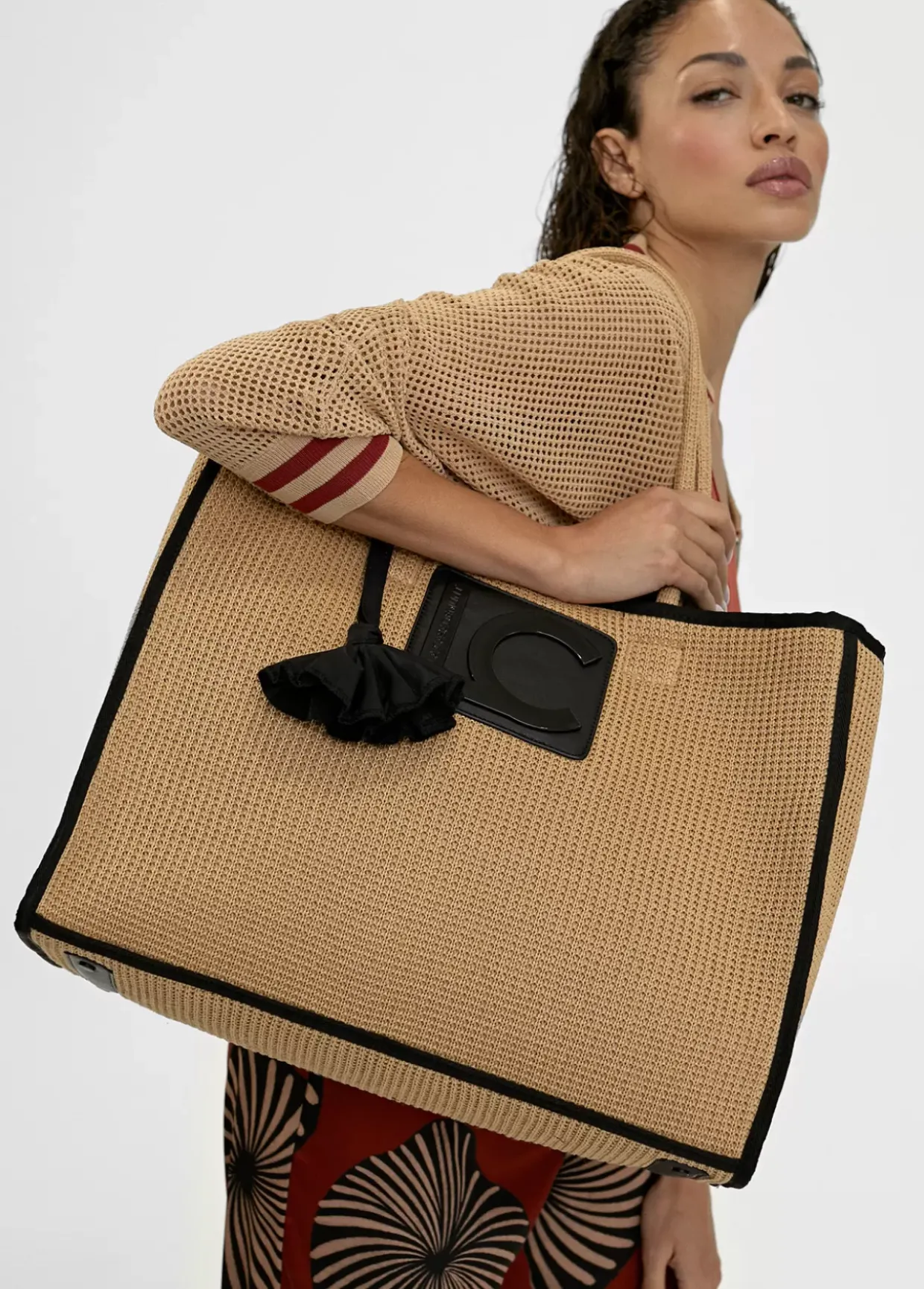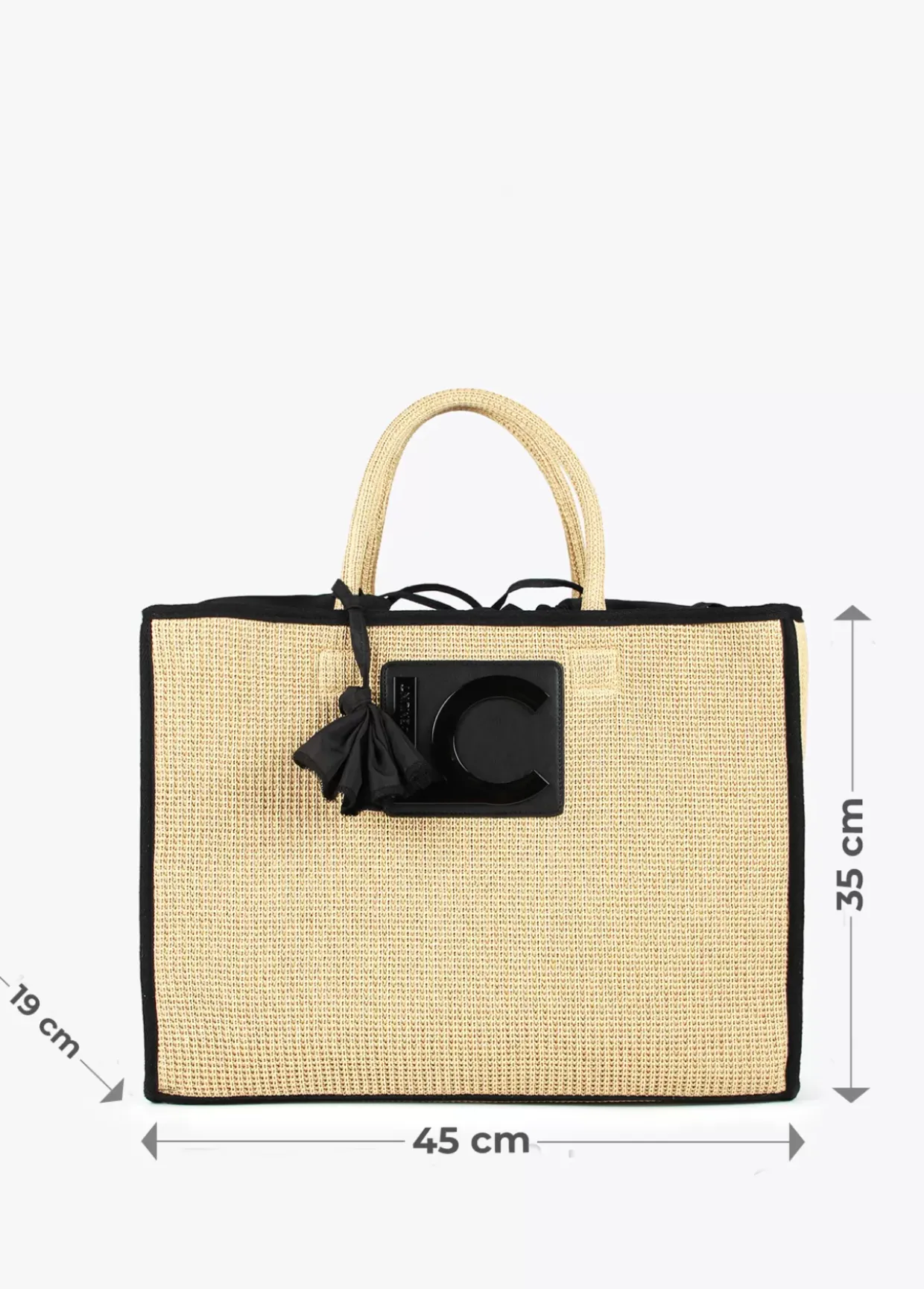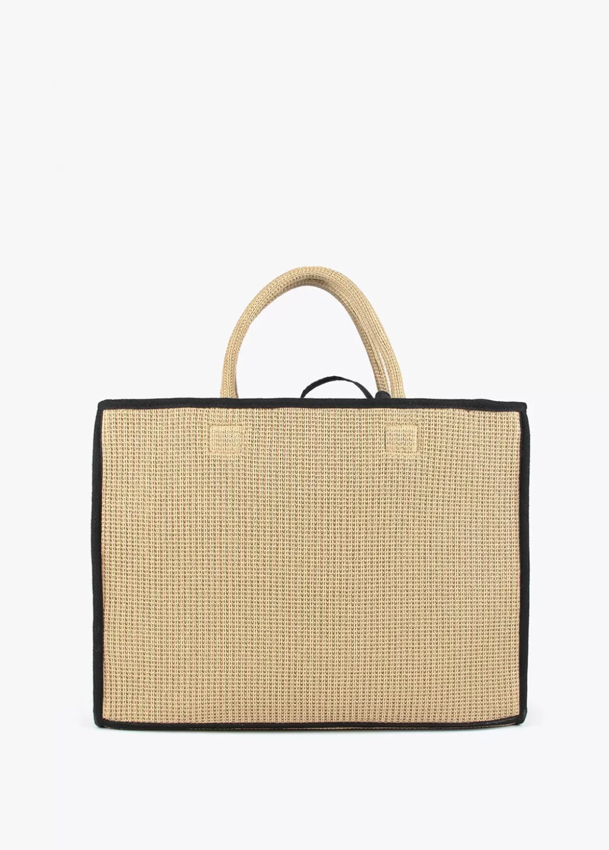 Bolso tipo capazo en efecto ráfia y detalles en efecto piel. Ribetes a contraste y logotipo lacado en parte frontal. Bolsa interior protectora con cierre de cordón y detalle pompon extraíble.