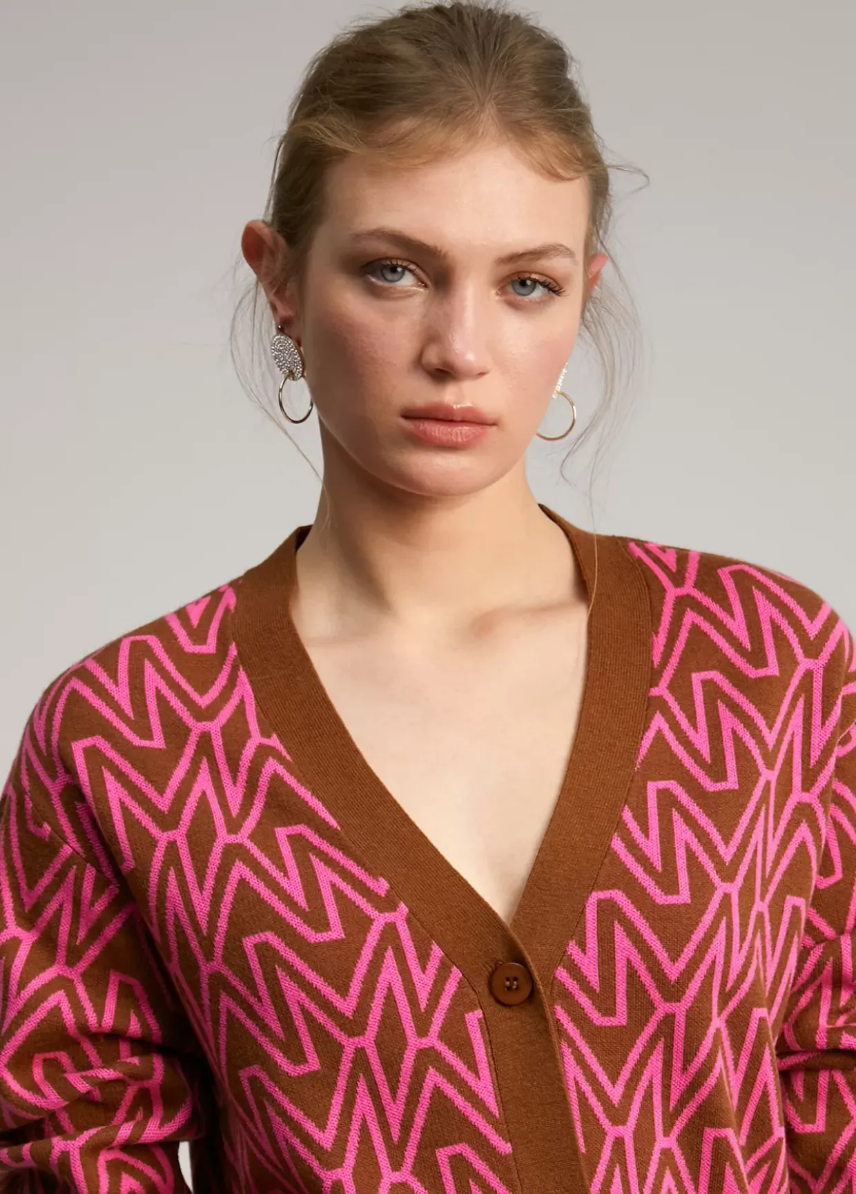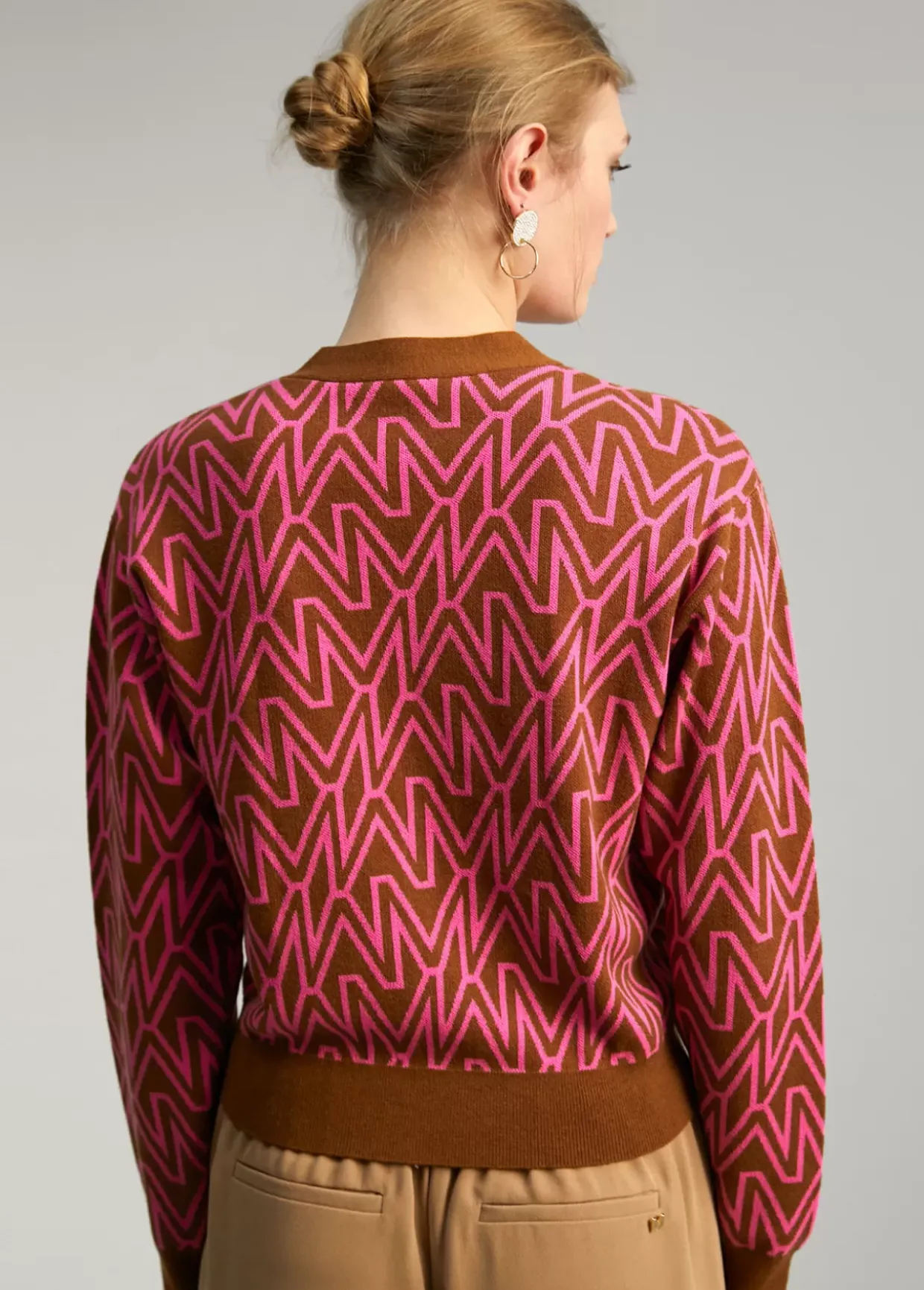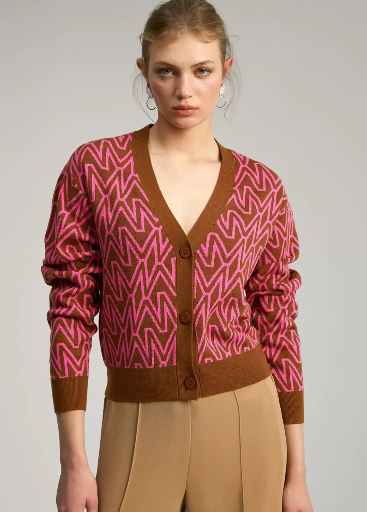 Cárdigan corto estampado monograma M bicolor. Cerrado con botones a tono. Rib contrastado en frontal, puños y bajo.