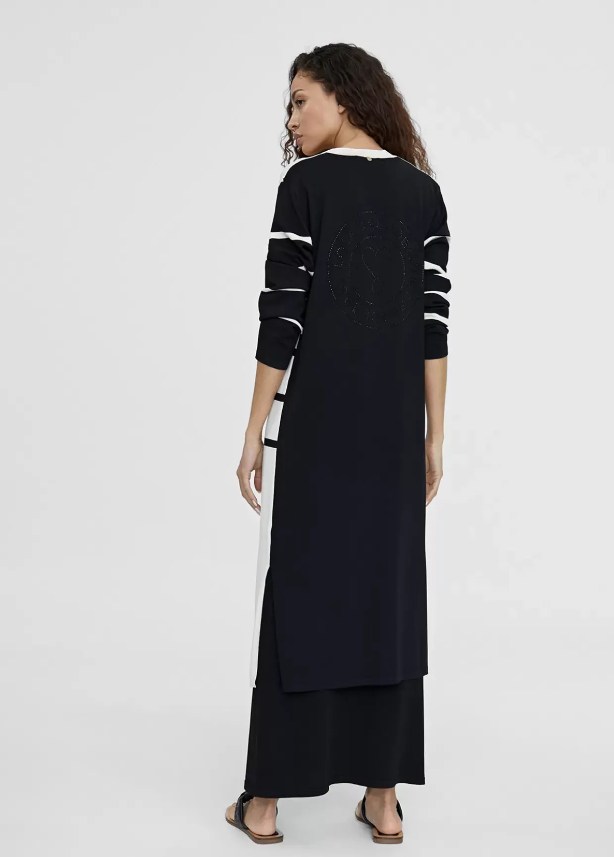 Cardigan largo de punto. Combinado de rayas horizontales. Cerrado con botón dorado. Aberturas laterales.