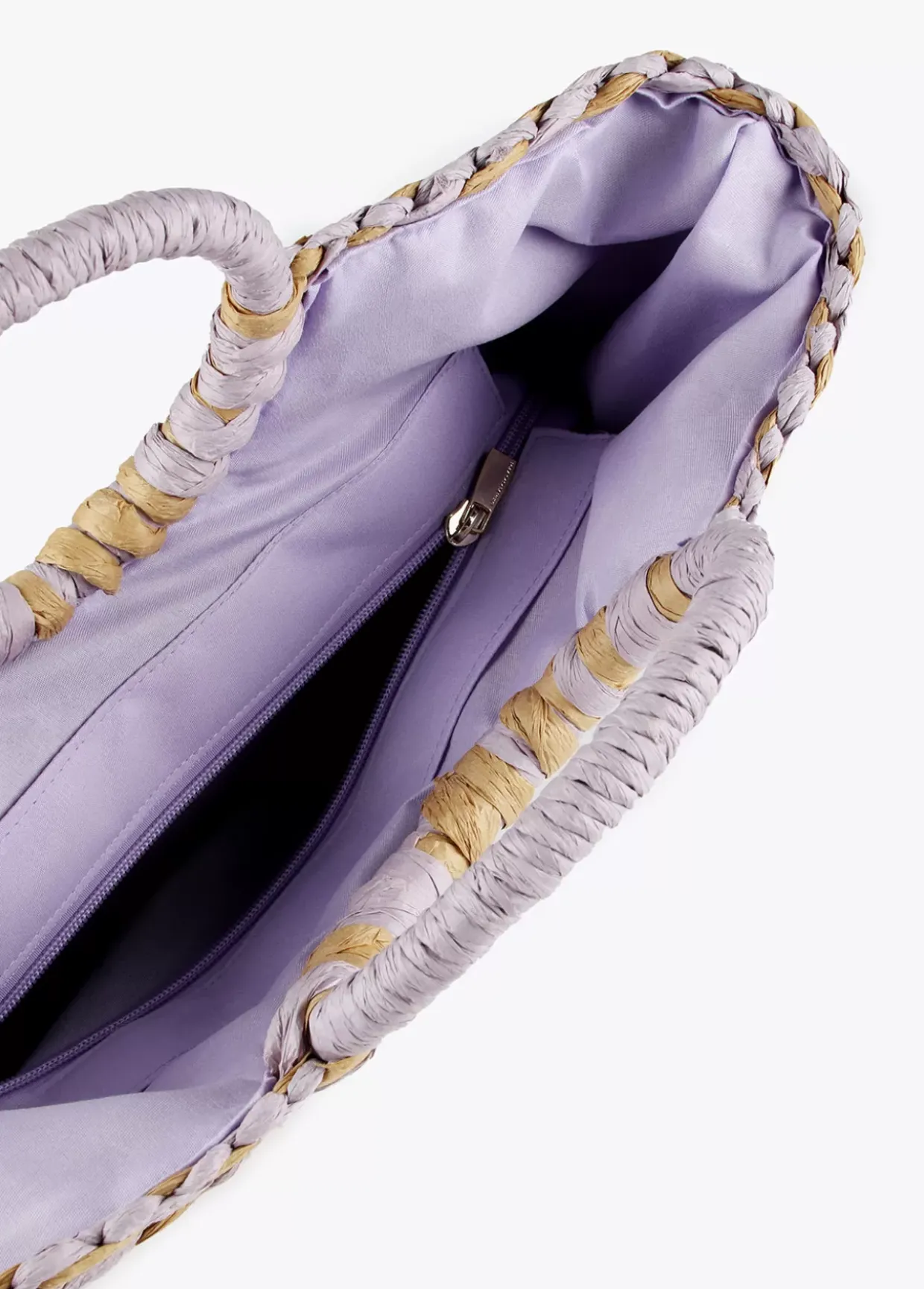 Cesto semicircular bicolor en efecto ráfia con logotipo lacado en parte frontal. Asas de mano y cierre central de cremallera en bolsa protectora interior.