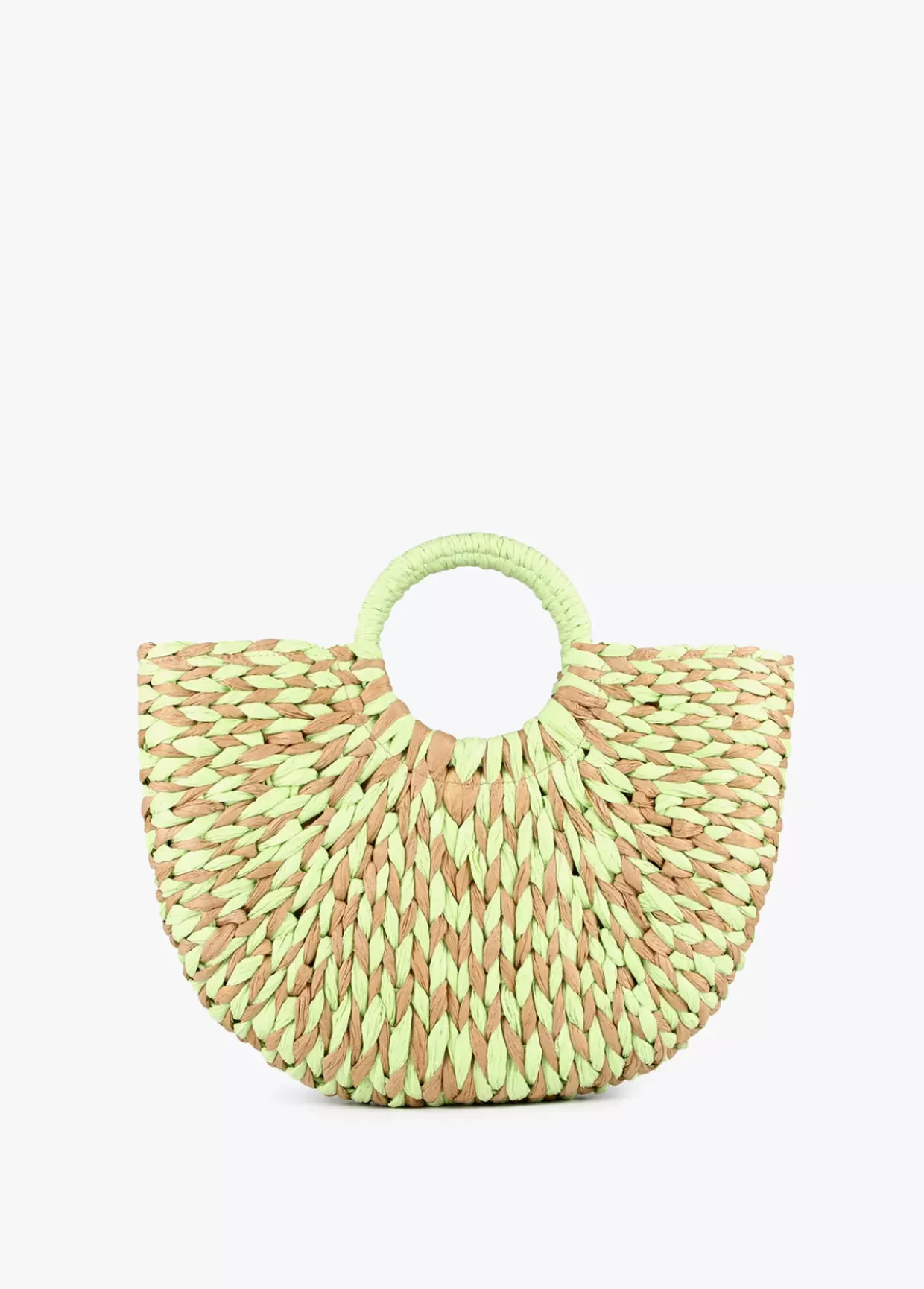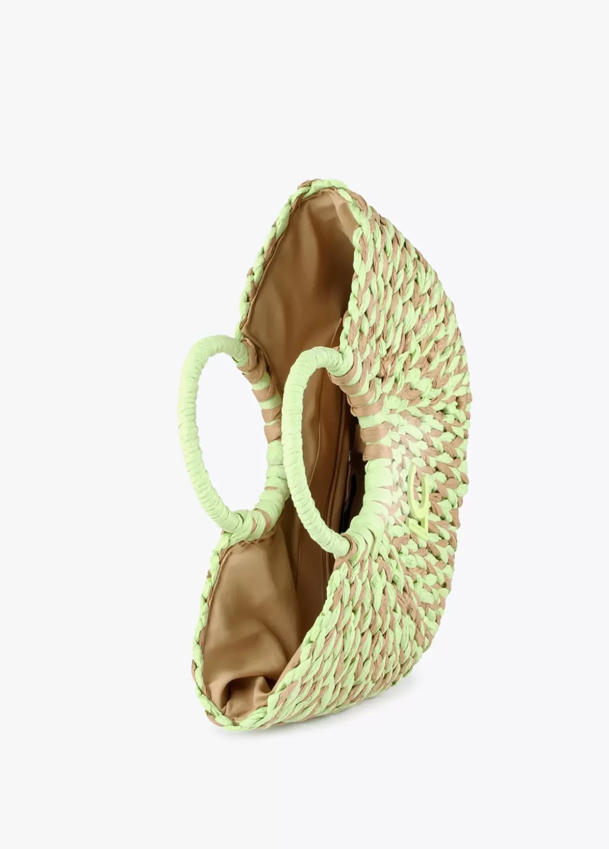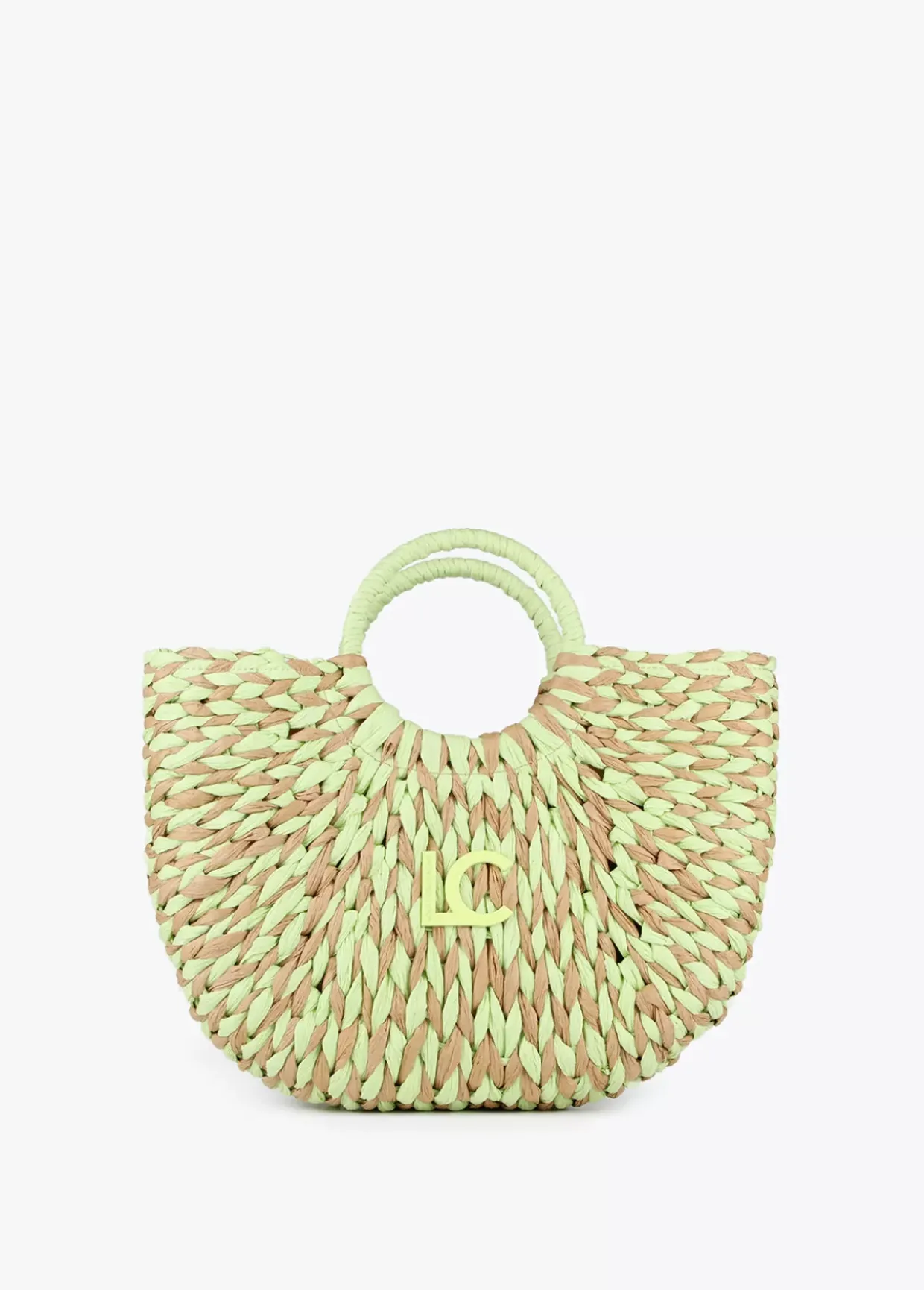 Cesto semicircular bicolor en efecto ráfia con logotipo lacado en parte frontal. Asas de mano y cierre central de cremallera en bolsa protectora interior.