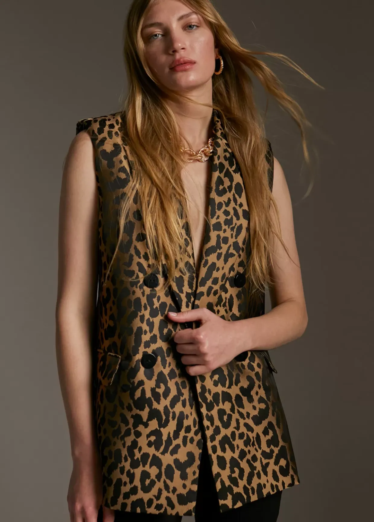 Chaleco recto en estampado animal print. Cuello solapa y hombreras. Botones centrales y tapetes laterales.